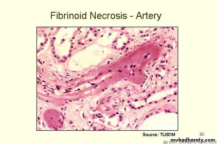 Type of connective tissue necrosis especially affecting arterial walls.Mostly seen in two conditions