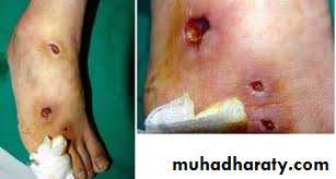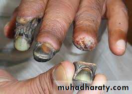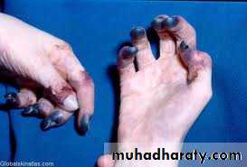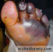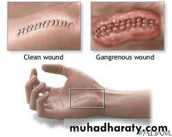 Gangrene is the necrosis of tissue with superadded putrefaction (enzymatic decomposition).It is the clinical condition in which extensive tissue necrosis is complicated to a variable degree by secondary bacterial infection.