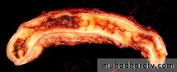 Chalky white opaque spots surrounded by inflammatory margins are seenNecrotic area shows acute inflammatory changes with dissolved fat cells