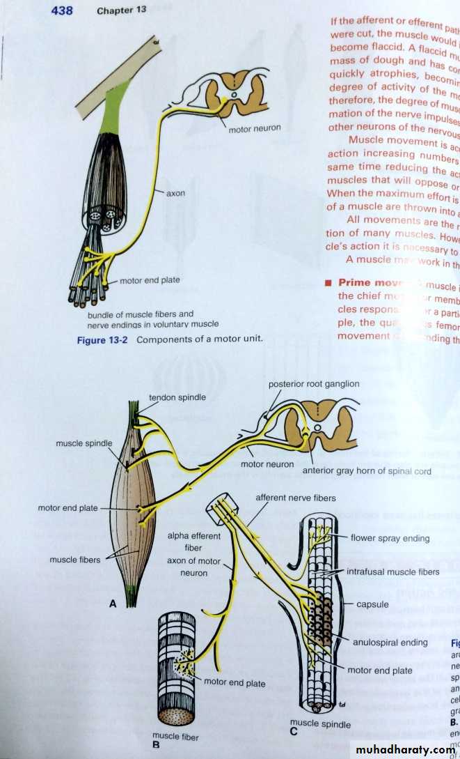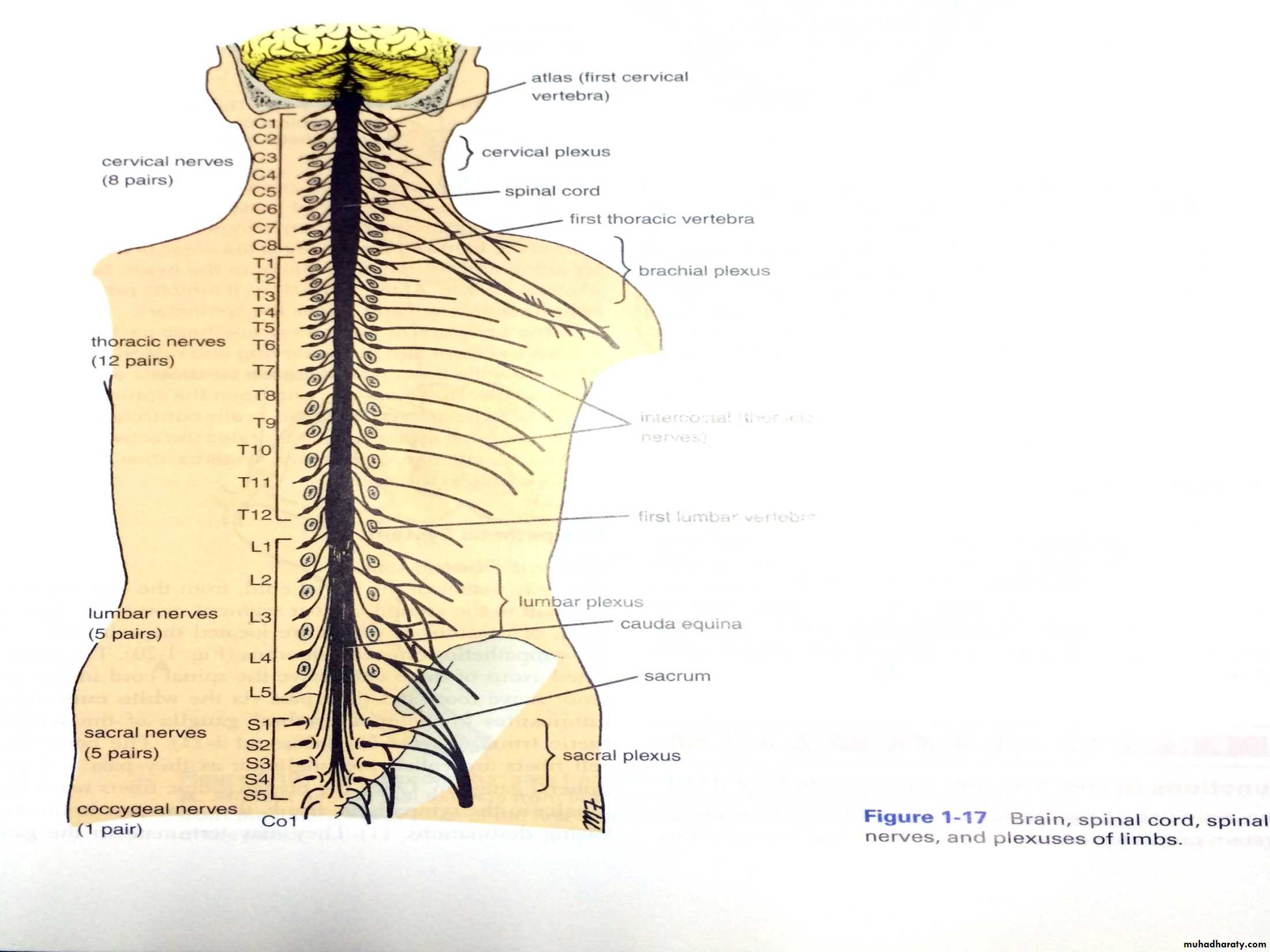 Total of 31 pairs of spinal nerves leave the spinal cord & pass through the intervertebral foramina in the vertebral column.They includes 8 pairs of cervical nerves, 12 pairs of thoracic , 5 lumbars , 5 sacral & 1 coccygeal.Each spinal nerve is connected to the S.C by 2 roots ,anterior ( ventral) & posterior ( dorsal ) roots.The anterior root contains motor fibers ( Efferent) ,while posterior root contains sensory ( Afferent ) fibers.The motor fibers goes to skeletal muscle fibers & cause them to contract& their cells of origin are located in anterior horn of the S.C ( lower motor neurons).