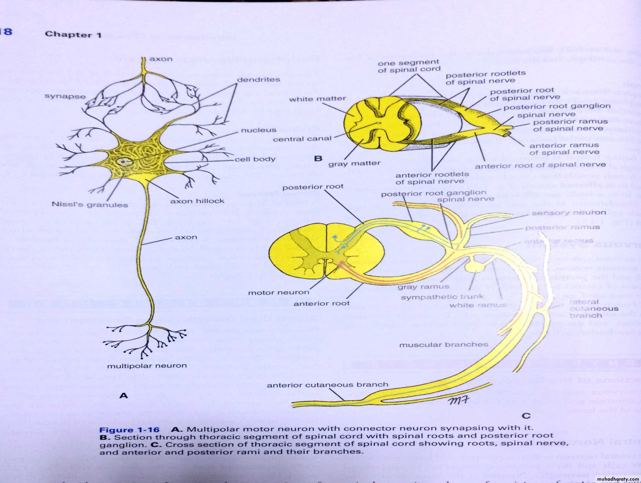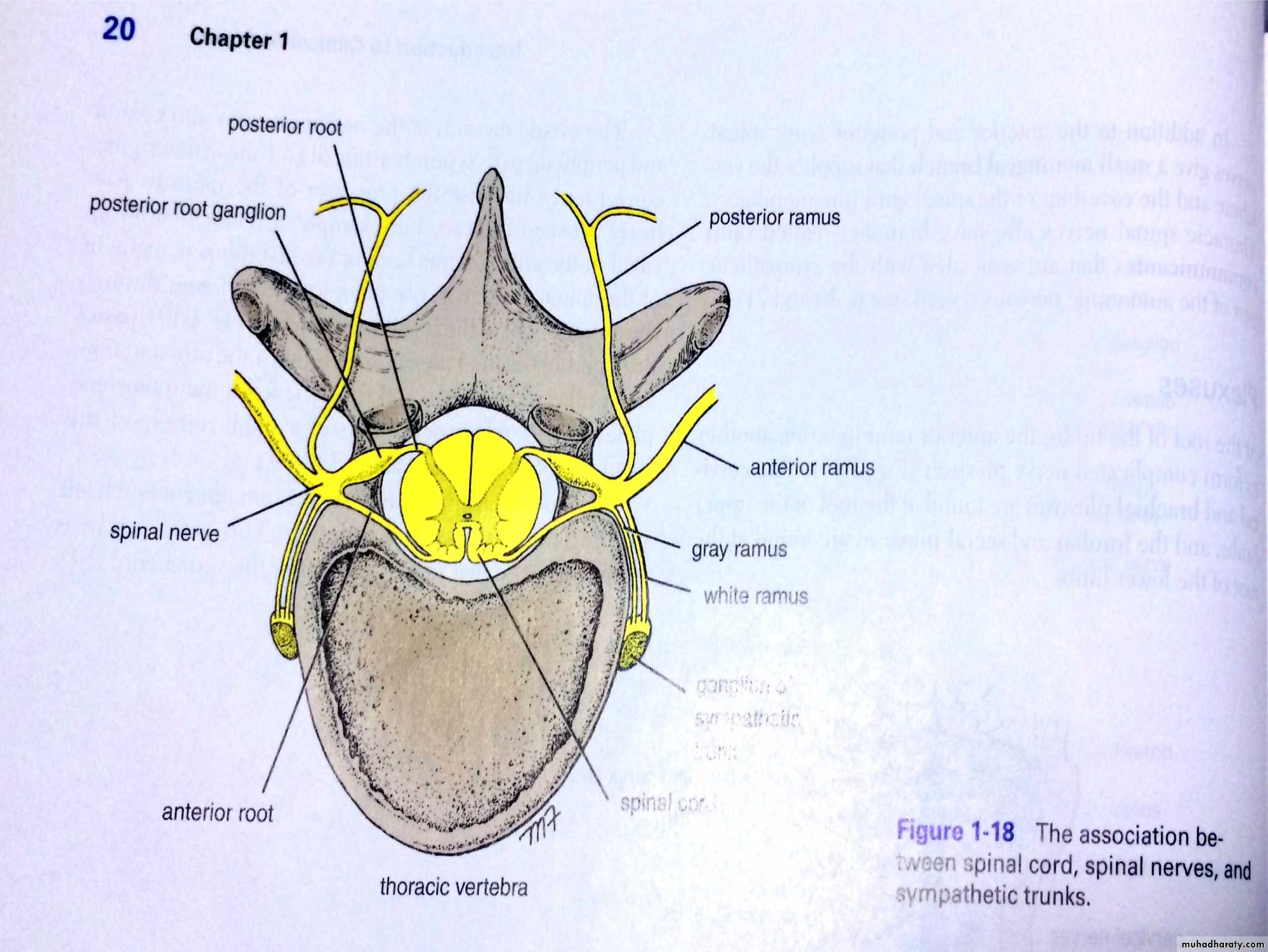 The posterior root contains bundles of sensory fiberscarrying impulses ( sensations to the C.N.S) and are called Afferent & the cell bodies of these N.Fs are situated in a swelling on the posterior root ganglion.At the intervertebral foramen both roots unite together forming the spinal nerve proper( mixture of N.Fs),after emerging from the intervertebral foramen ,the spinal nerve divides in to 2 rami ( contains sensory & motor fibers) a ventral & dorsal rami to supply skin & muscles.
