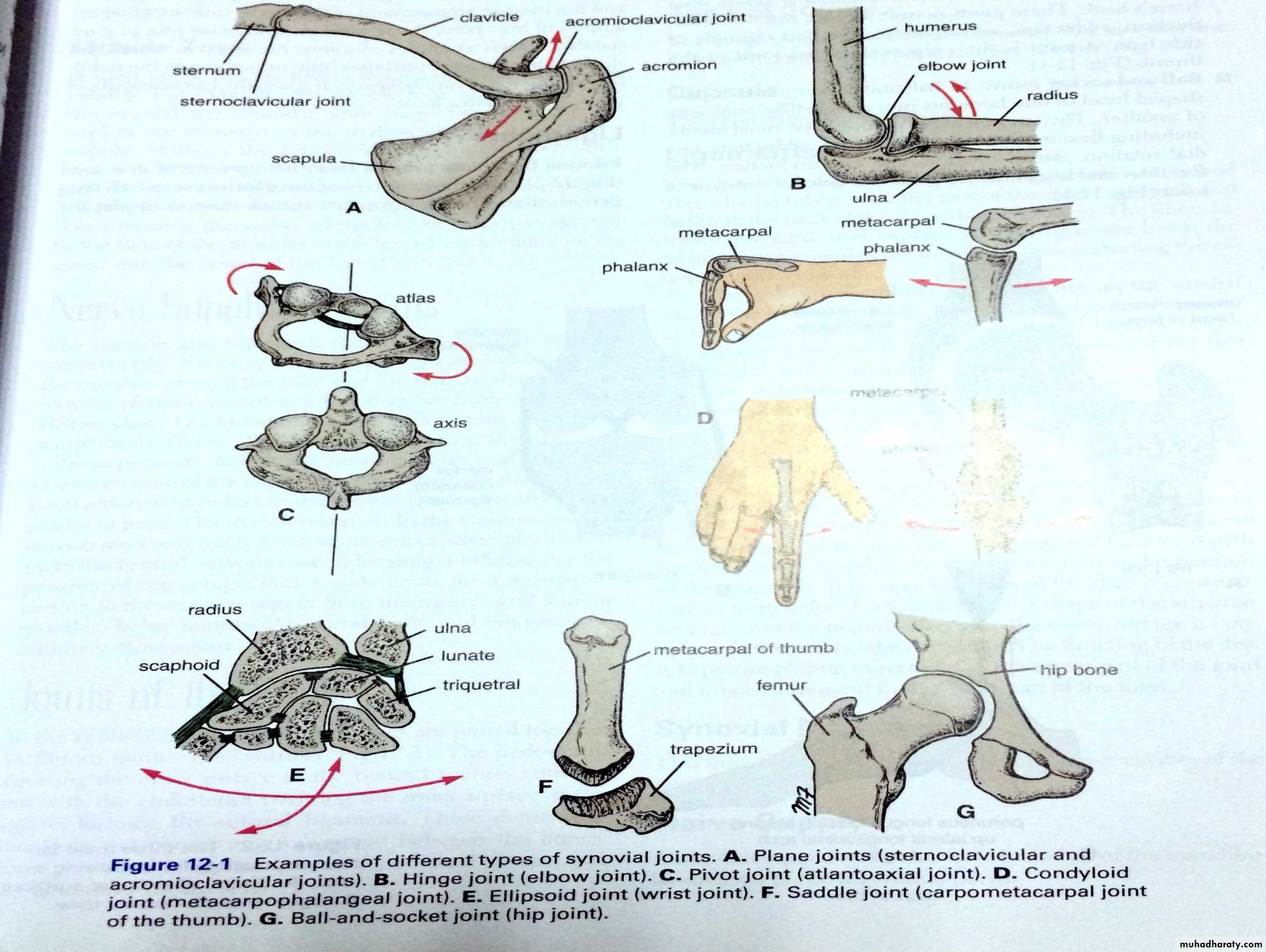 C-Synovial joint where there are articular cartilages covering the opposed ends of 2 bones,capsule to cross the gap of the joint & connecting the 2 bones in addition there is synovial membrane & cavity in side the joint to reduces friction completely & allow freedom of movements at the joint>The synovial joint are classified as follows: