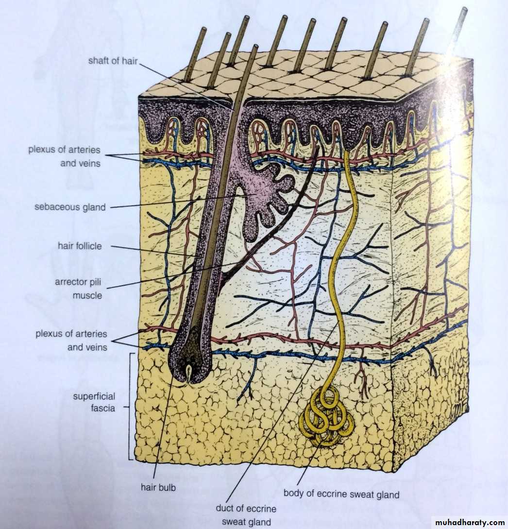 It covers the body surface & consists of 2 layes outer Epidermis ( stratified squamous epithelium which is keratinized at some places) & inner layer known as Dermis>Under the skin we can see superficial fascia & subcutaneous tissue .The skin is rich in sensory nerve endings>The skin has the following Appendages :