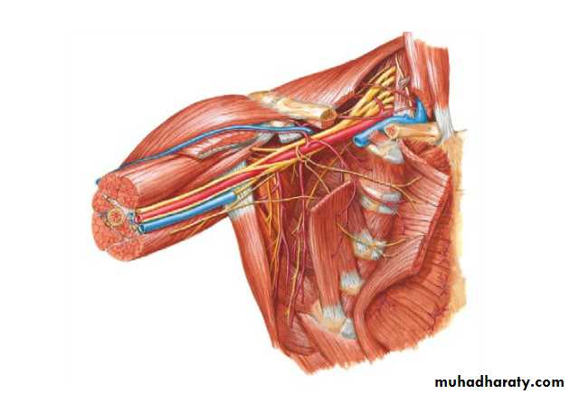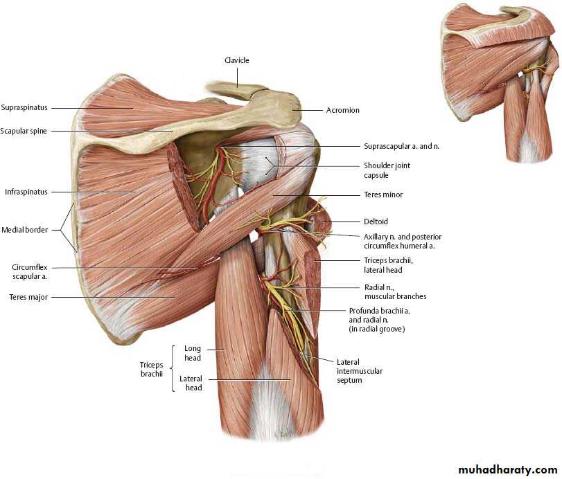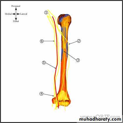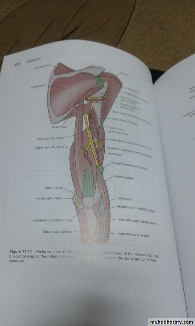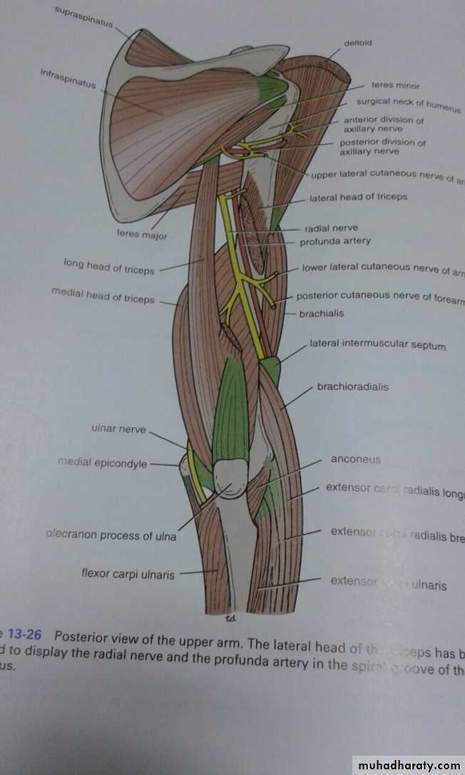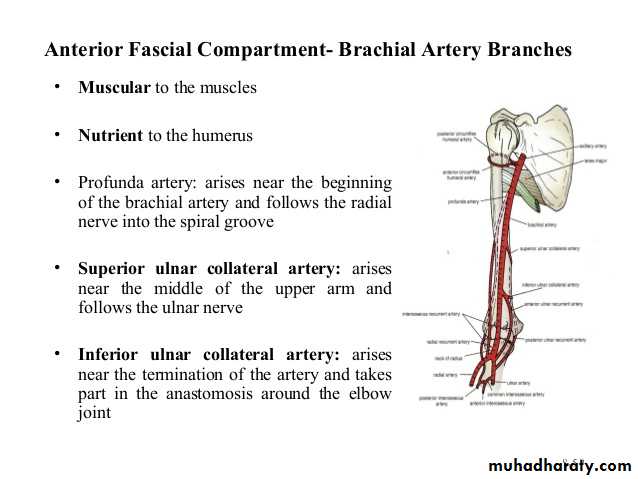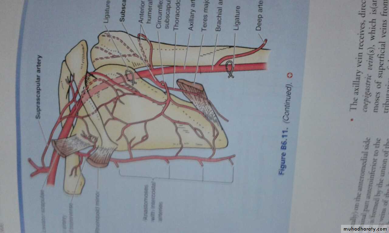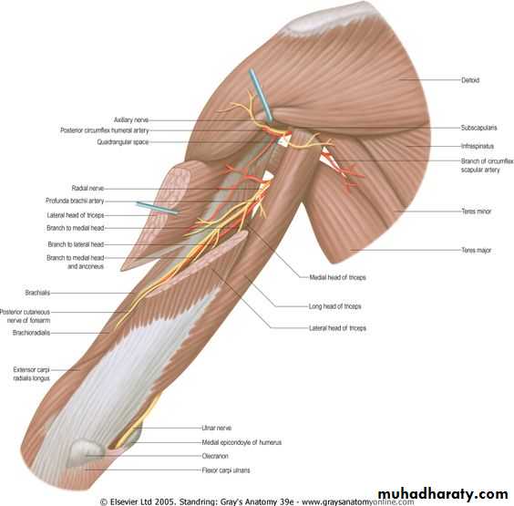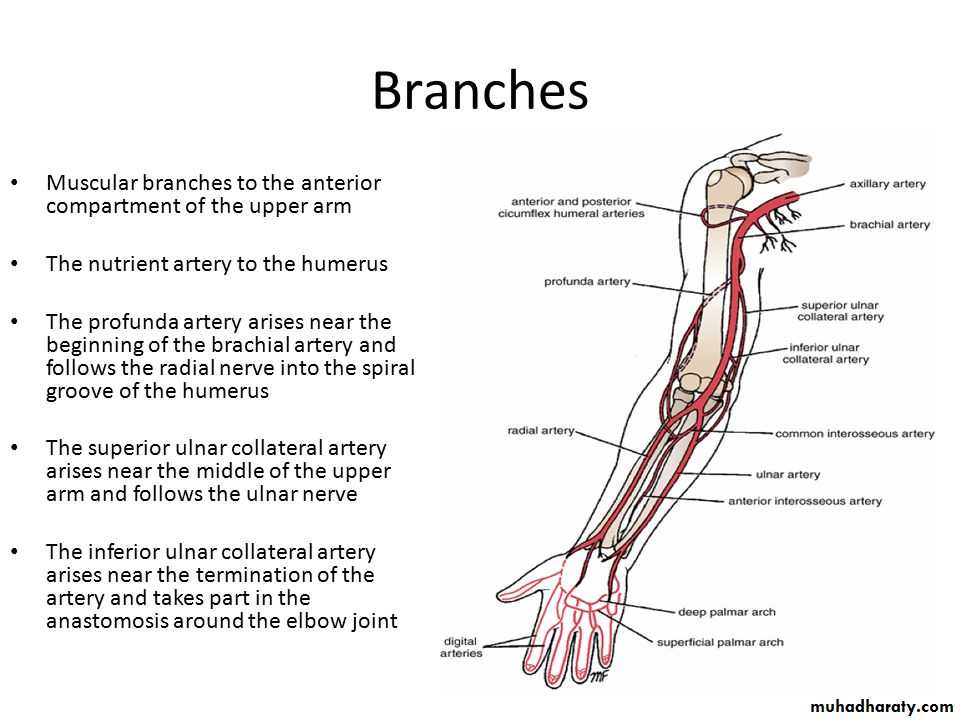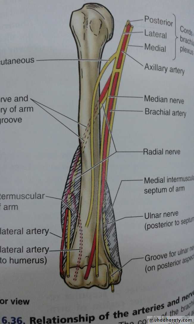 1-Profunda brachi ( Deep brachial )which goes to the Radial( spiral ) groove on the back of the shaft of the humerus accompanies by the Radial nerve ( after the Axilla).