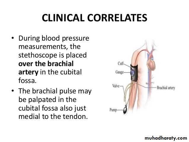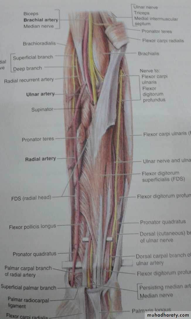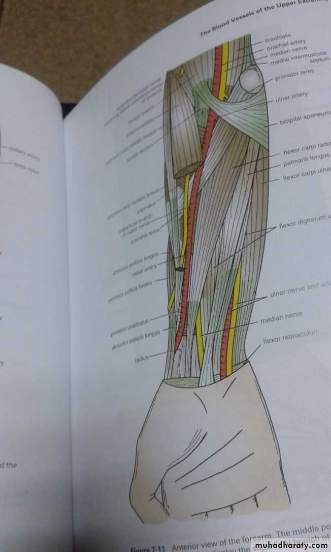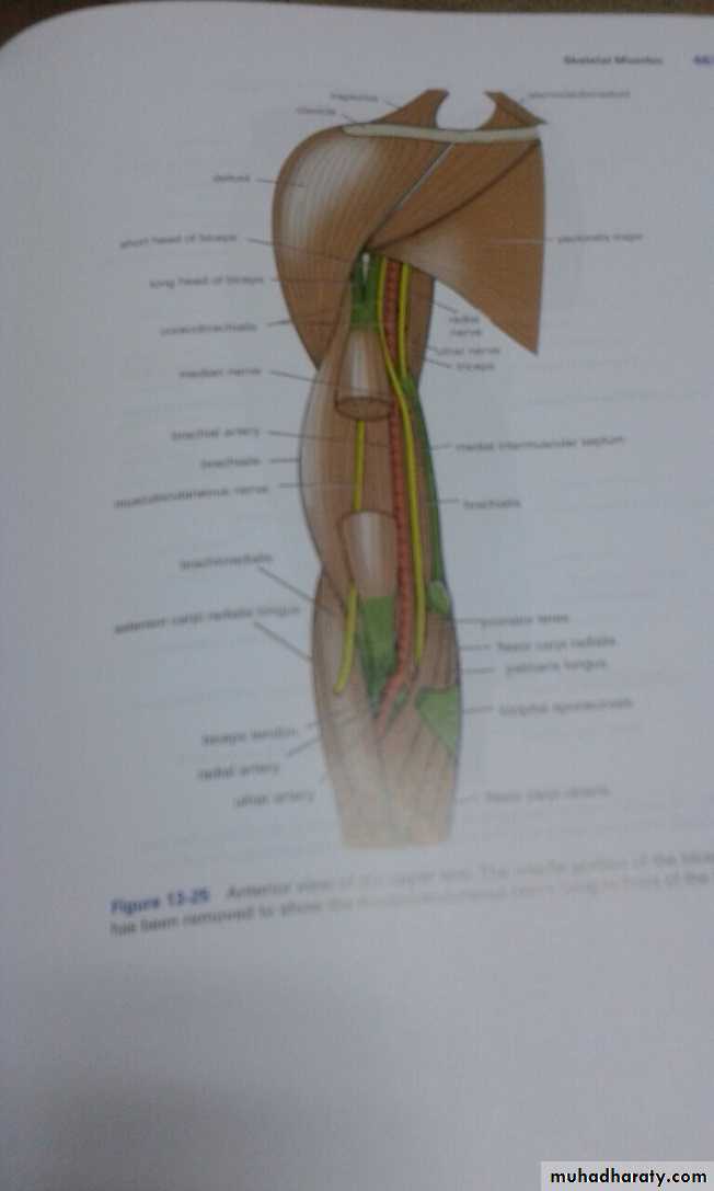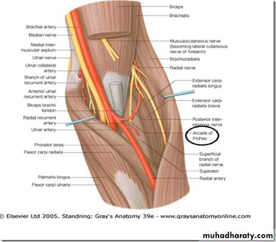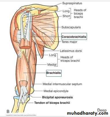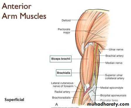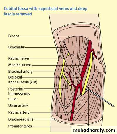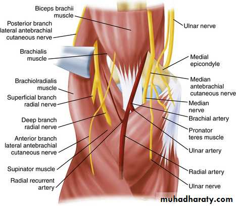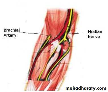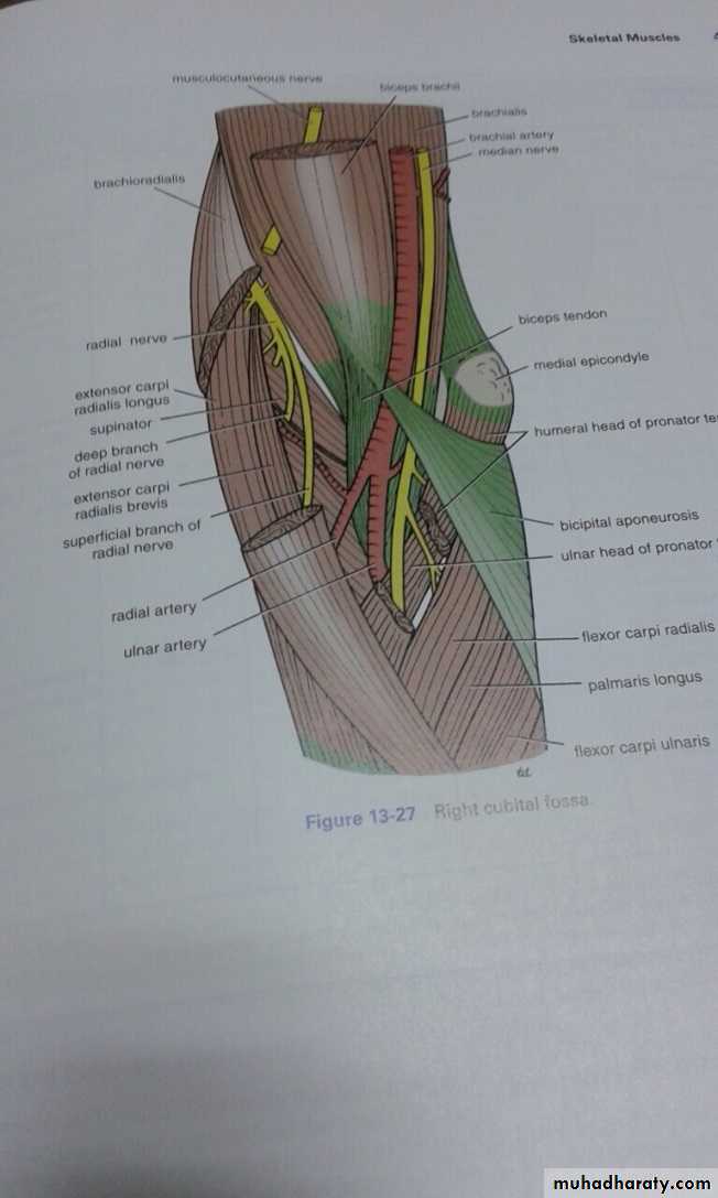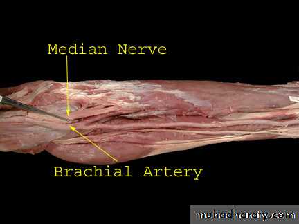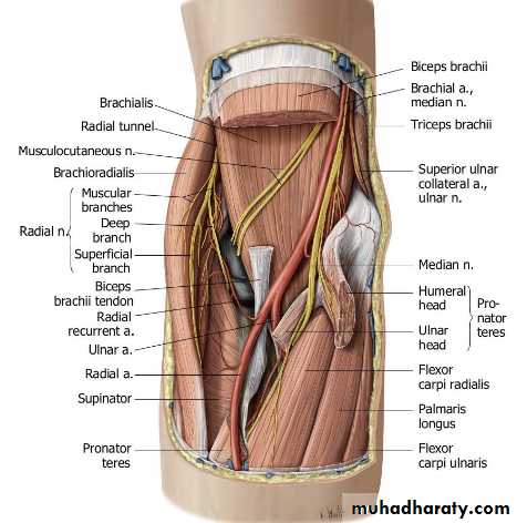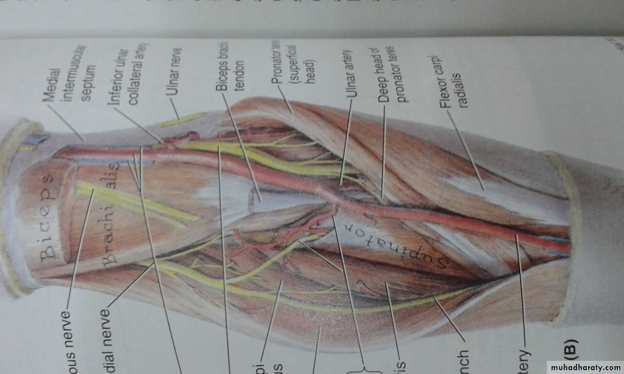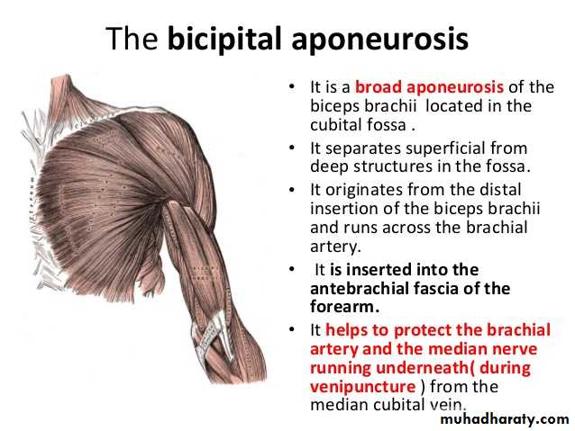 Note: As the tendon of Biceps passes through the front of Elbow(Cubital fossa) in its way to its insertion site,it sends a flat ribbon like aponeurosis medially & superficially to cover the terminal part of the brachial A+ the Median nerve known as Bicepital Aponeurosis.