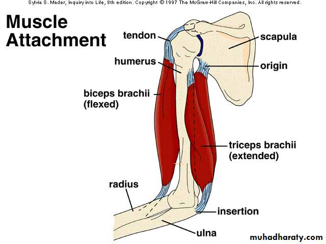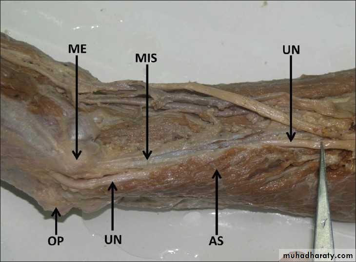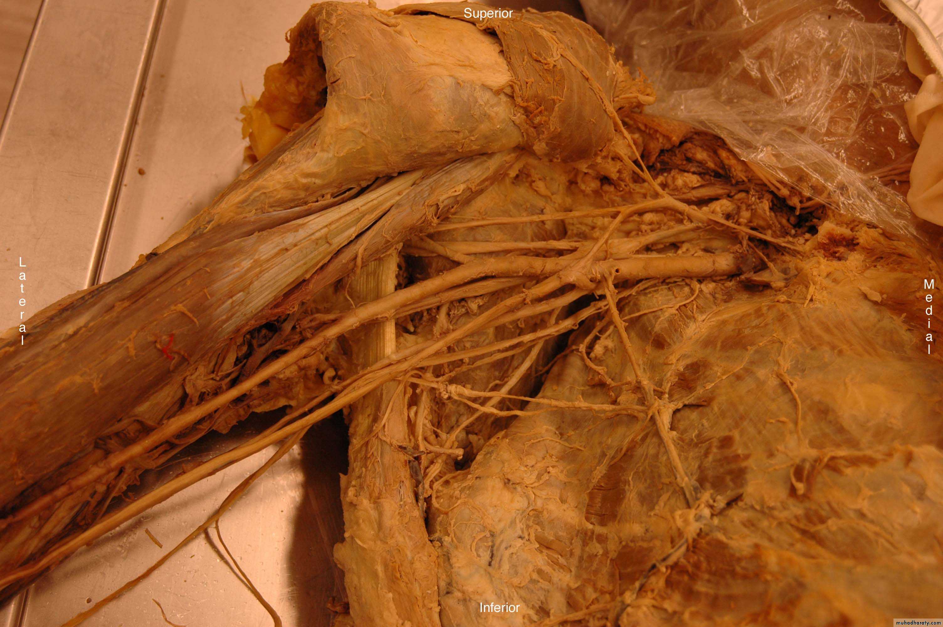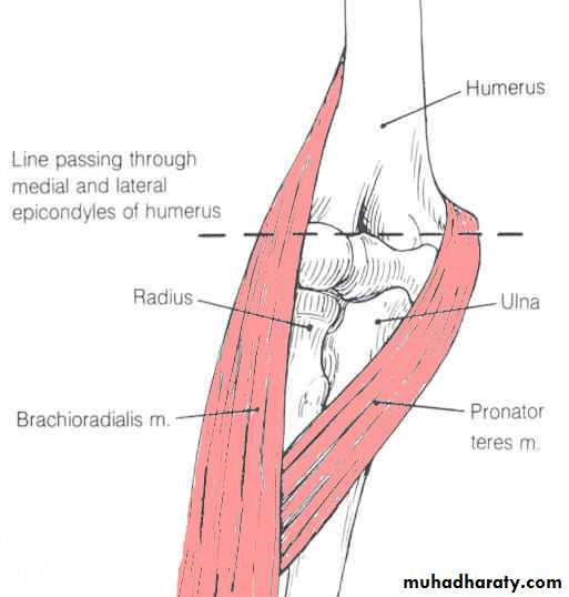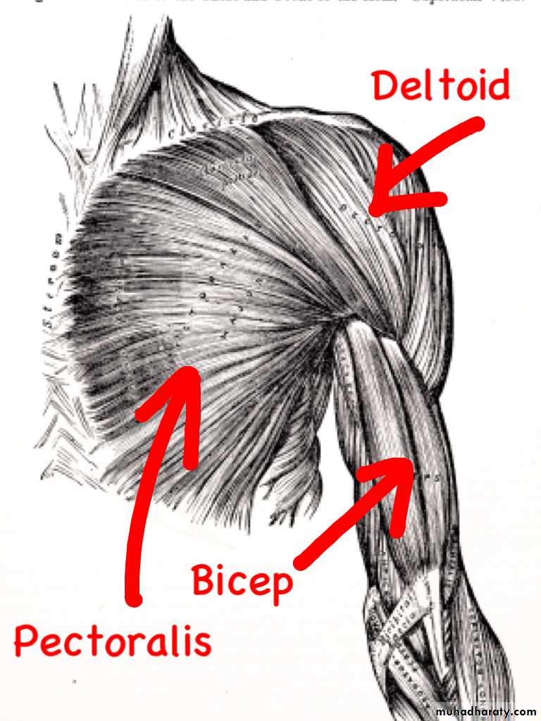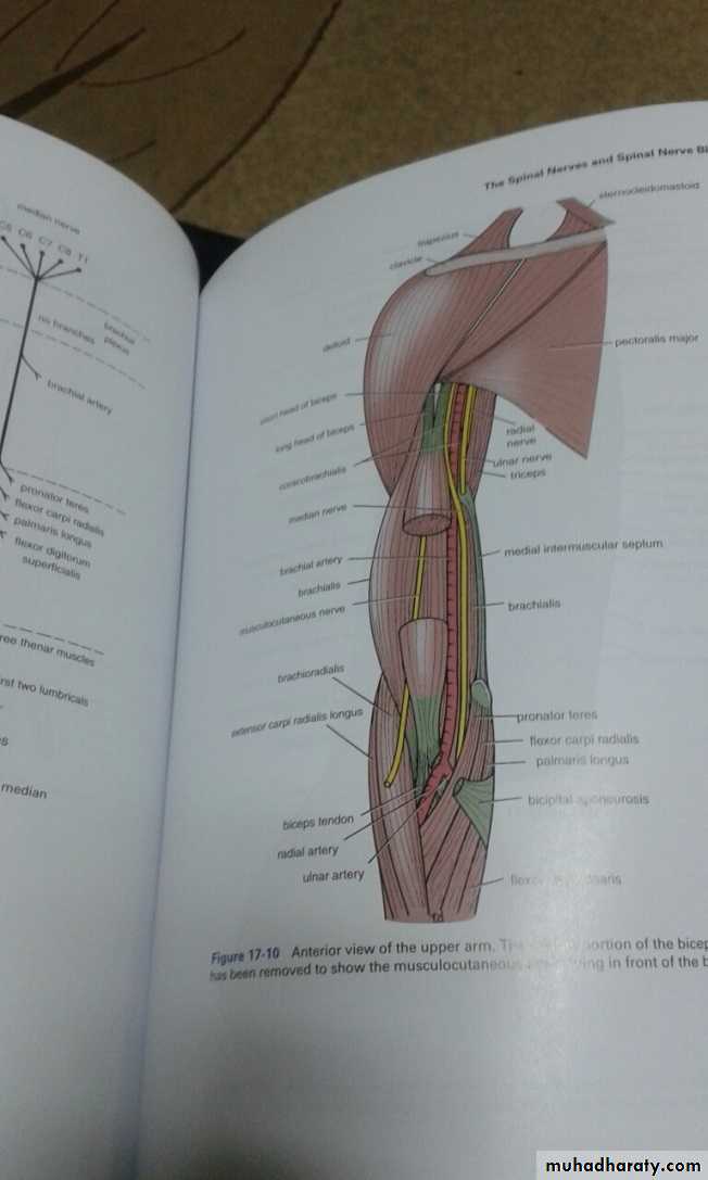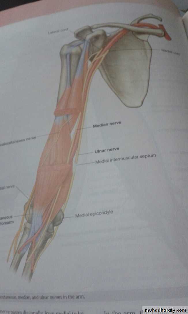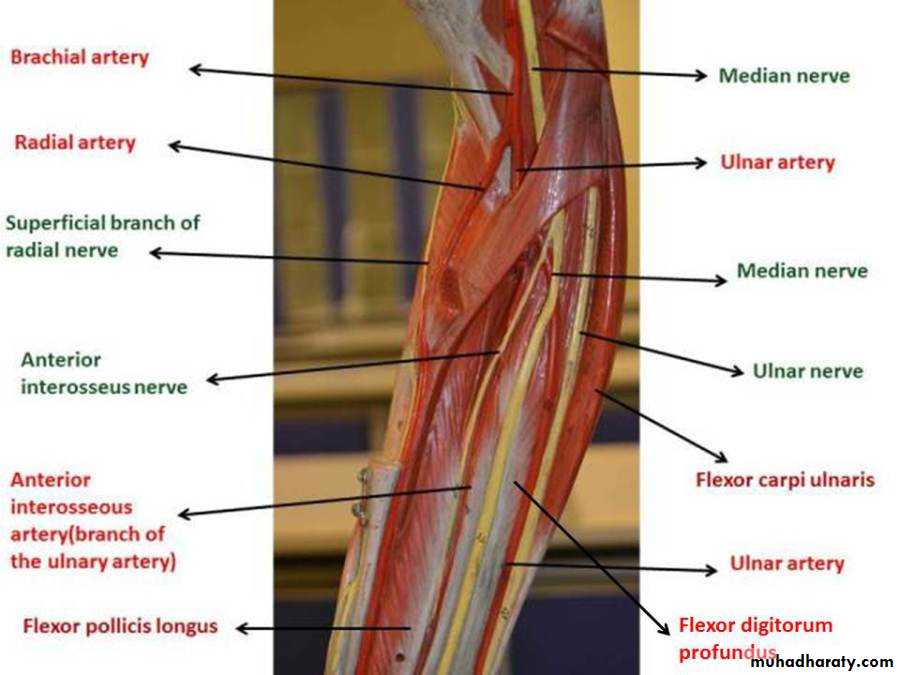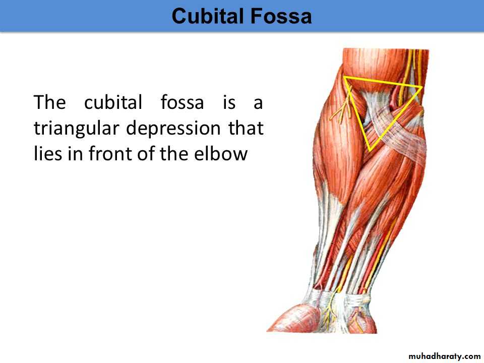 Note: As the tendon of Biceps passes through the front of Elbow(Cubital fossa) in its way to its insertion site,it sends a flat ribbon like aponeurosis medially & superficially to cover the terminal part of the brachial A+ the Median nerve known as Bicepital Aponeurosis.
