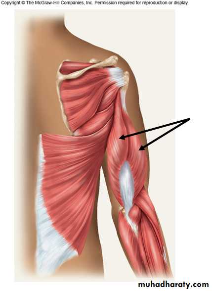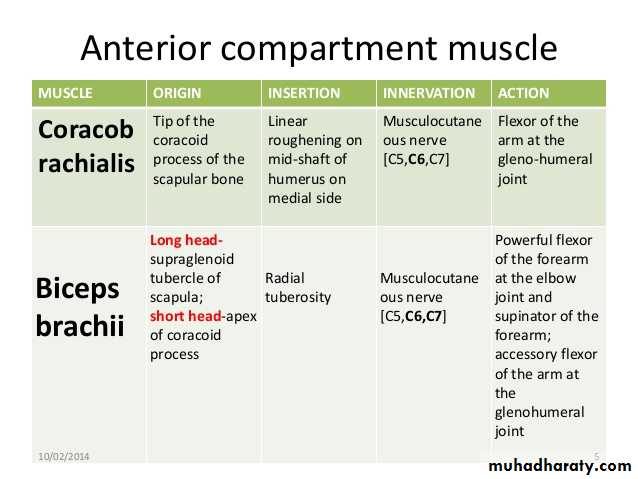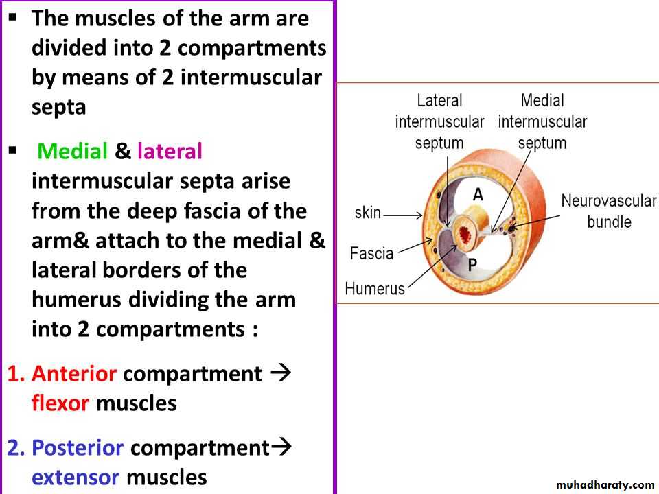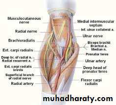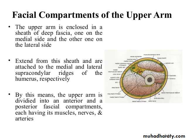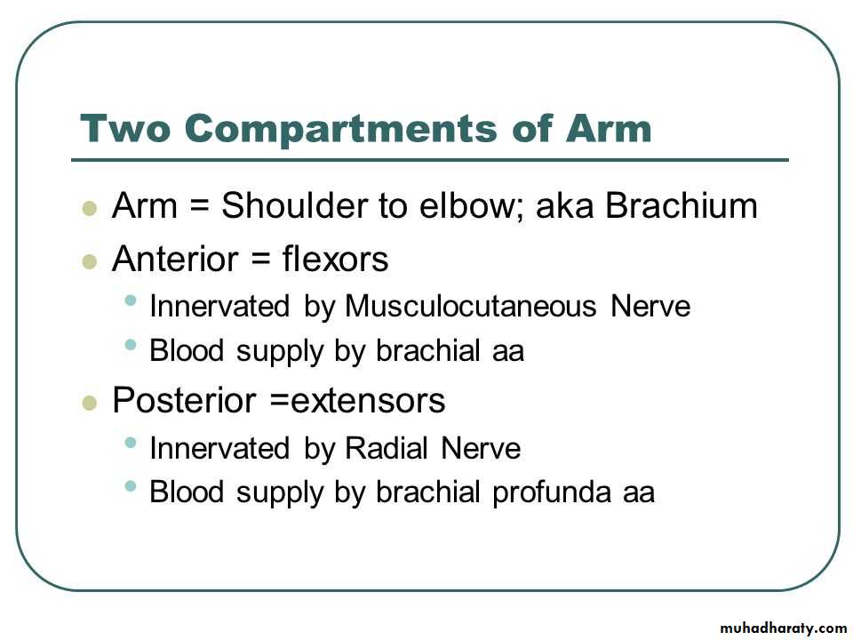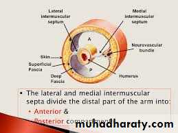 The arm is surrounded by deep fascia which sends 2 septae attaching to medial & lateral compartments,an anterior ( B.B.C muscles which are flexors at the Elbow joint),these Ms are Biceps brachi,Brachialis & Coracobrachialis.The posterior compartment is an Extensor compartment at the Elbow joint mainly Triceps M & lower down a small M (Anconeus M ).