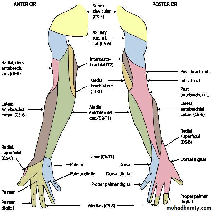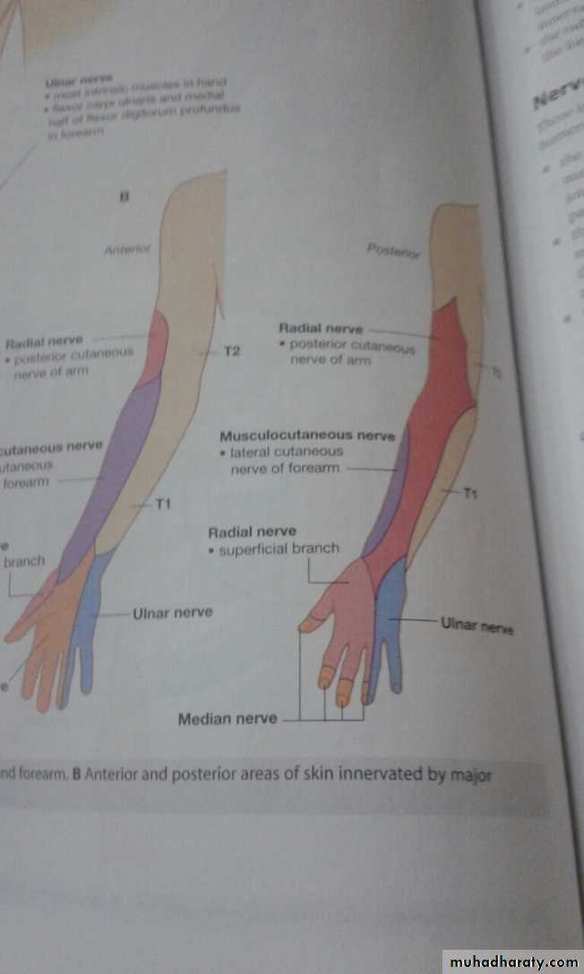 2-Lateral cutaneous of F.A from Musculocutaneous nerve.3-Posterior cutaneous of F.A from the Radial nerve as it runs in the spiral groove.