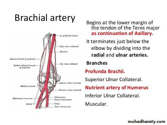 Is the direct continuity of the Axillary artery at the lower border of Teres major M ,it runs in the anterior compartment of the Arm & ends opposite the Neck of the Radius bone ( in the cubital fossa ) by dividing into Ulnar & Radial As.It gives the following branches: