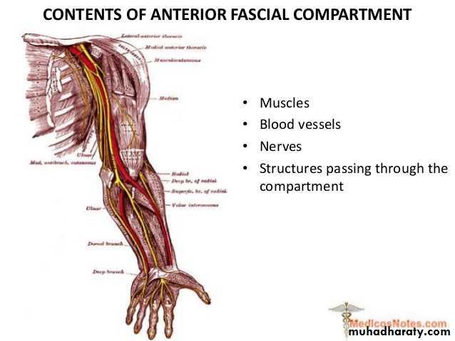 Note: The anterior compartment contains the followings:1-The 3 Ms i.e B.B.C .