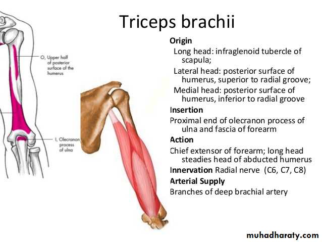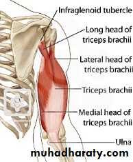 Thus the spiral groove separates the lateral head from the medial head of the Triceps.The muscle fibers of the 3 heads of origin converge inferiorly into a single tendon which is inserted into the top of the Olecranon process of the Ulna bone.The M is supplied by many branches from the Radial nerve at different levels& it is a powerfull Extensor muscle at the Elbow joint.