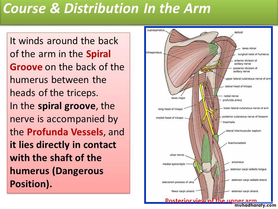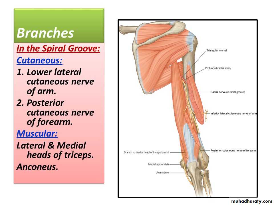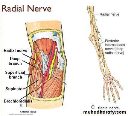 Is the direct continuity of the posterior cord after giving off its branches.In the Axilla it gives branches to long head & medial head of Triceps M & posterior cutaneous nerve of Arm. In the spiral groove it gives 4 branches 2 muscular ( many branches to medial & lateral heads of triceps + Nerve to Anconeus M) & other 2 branches as sensory these are lower lateral cutaneous of Arm & posterior cutaneous of F.A.Then the Radial N leaves the spiral groove & enters the lateral intermuscular septum with the Radial collateral A,then it leaves the septum to appear in the Cubital fossa between Brachialis & Brachioradialis Ms ( gives branches to both ),then it divides within the Cubital fossa into Superficial (sensory) & deep branch ( motor).The deep branch will pierce supinator & becomes posterior interosseous N.