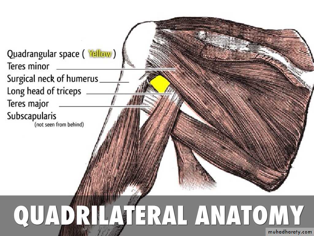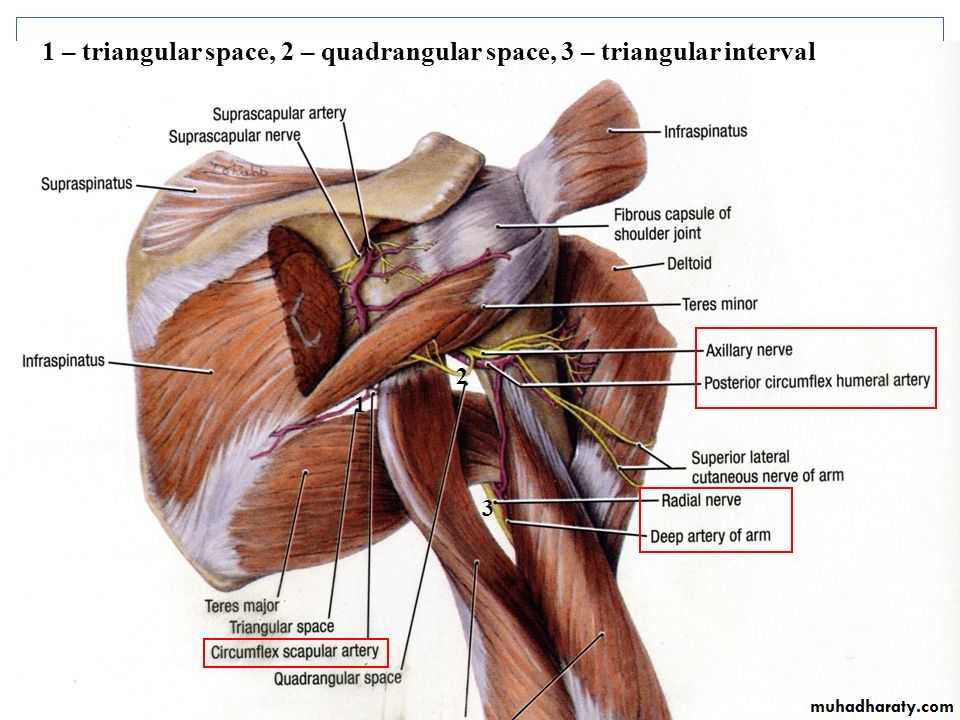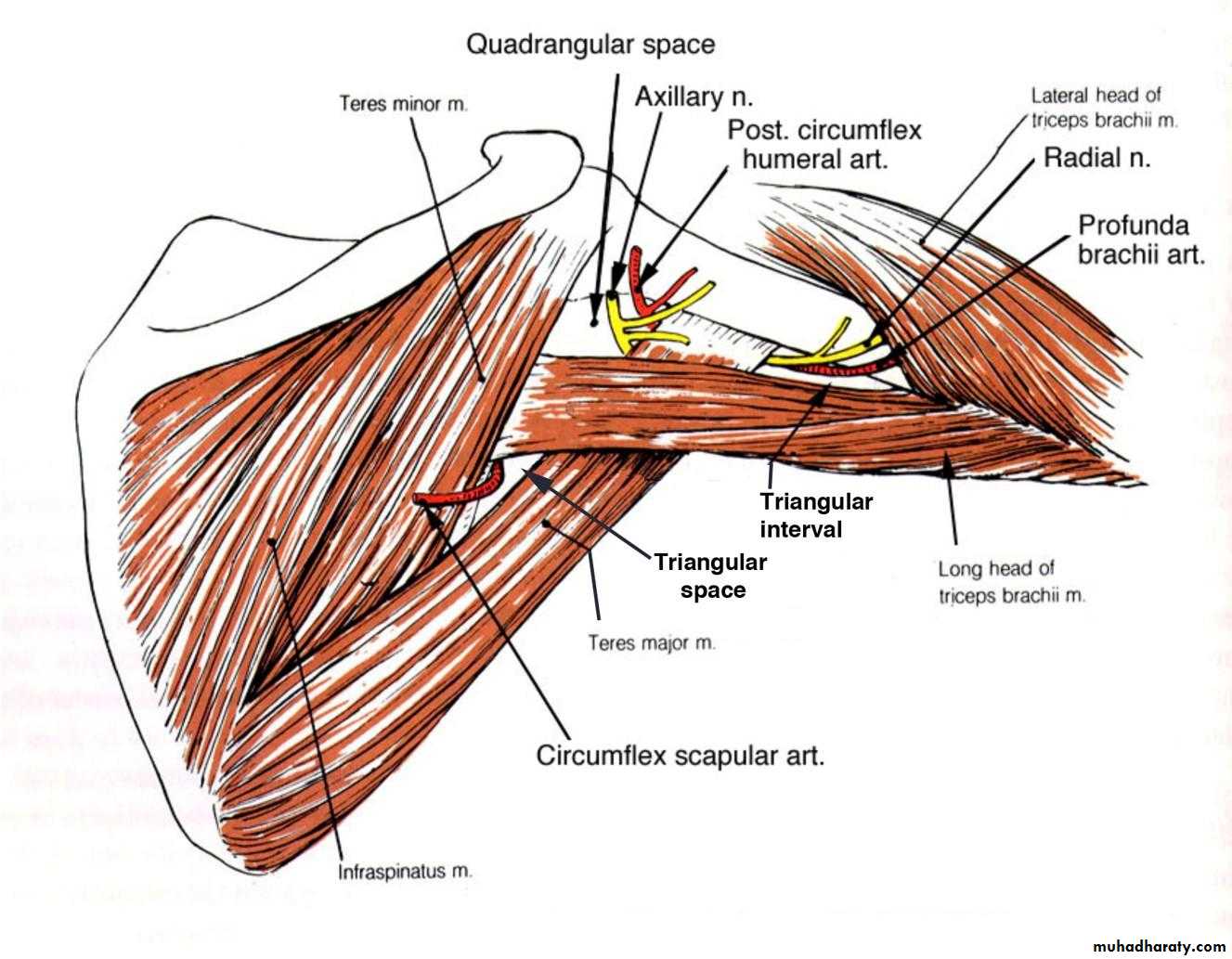 There are 2 main Triangular spaces, a superior horizontal one between teres minor ( above ), teres major ( below )& the Surgical neck of the Humerus laterally.This space is divided by the long head of Triceps into a smaller triangular space medially ( between teres minor,teres major & long head of Triceps)which transmits the Circumflex scapular branch of the Subscapular artery & a lateral Quadriangular space bounded by teres minor above,teres major below,long head of Triceps mediall and the Surgical neck of the Humerus laterally.This Quadriangular space transmits the Axillart nerve & posterior circumflex humeral A.The Axillary nerve as it passes through this space ,it divides into anterior & posterior divisions.