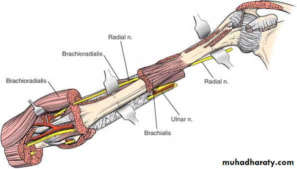 4-Radial nerve laterally emerging in the groove between Brachialis & Brachioradialis.