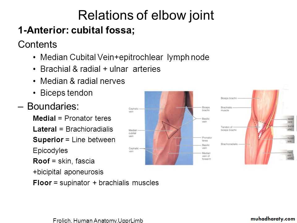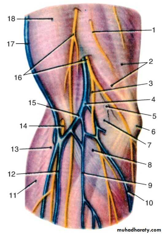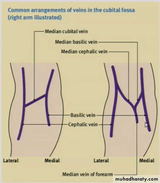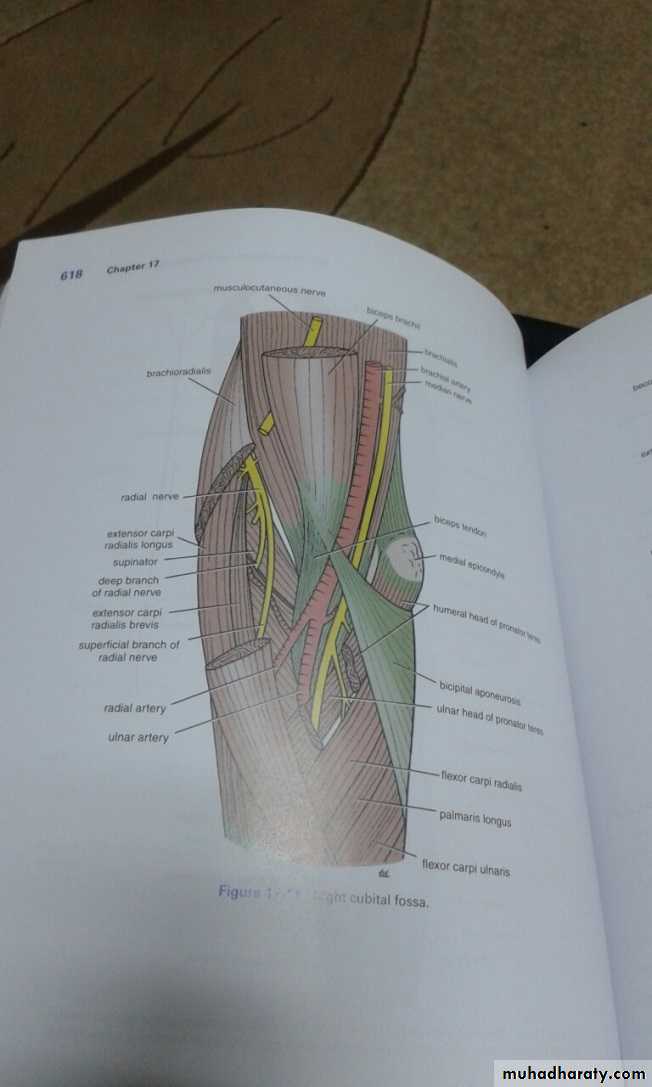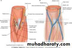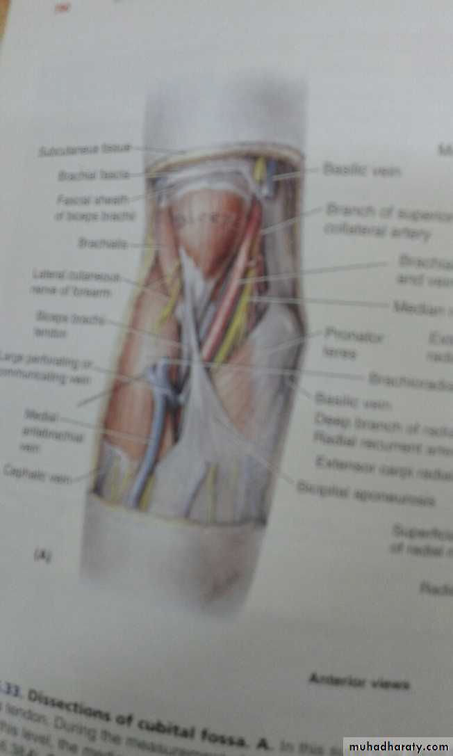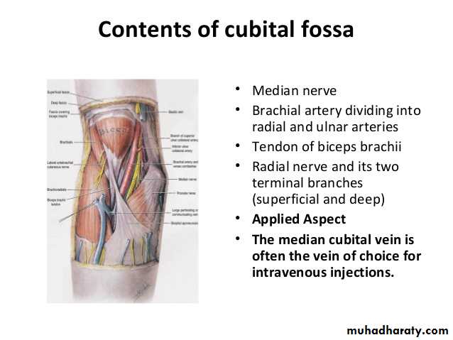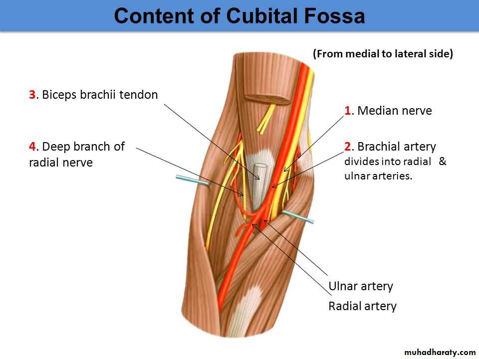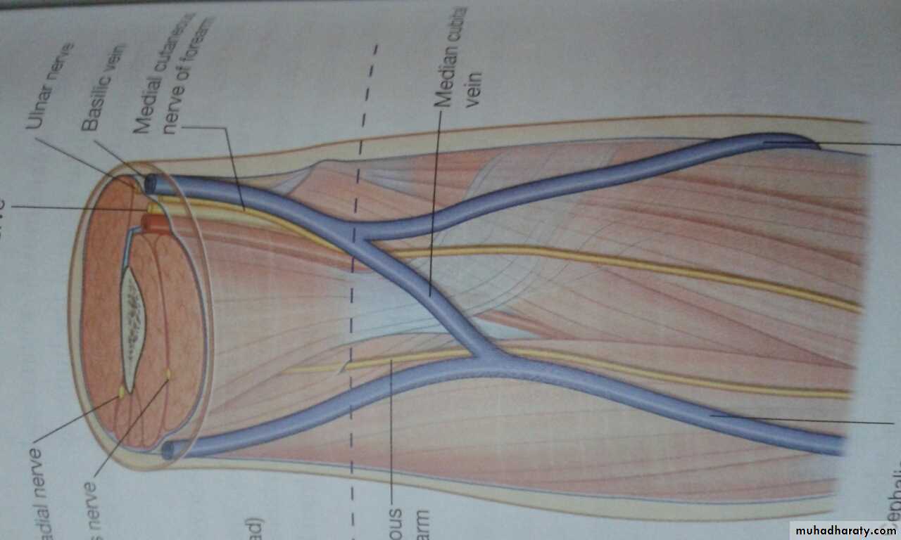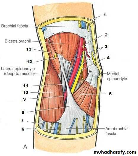 A-The superficial contents are :1-Median cubital vein joining the Cephalic & Basilic veins.