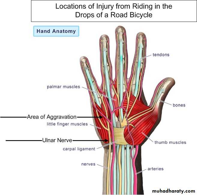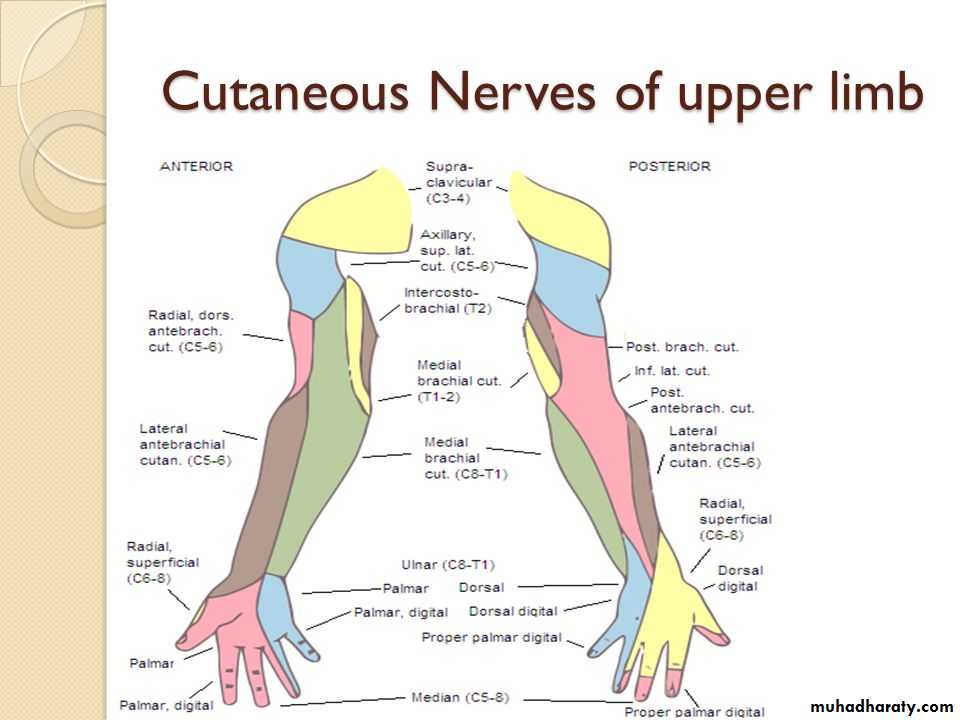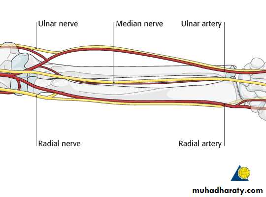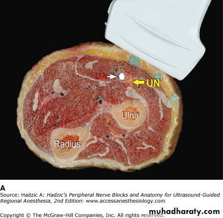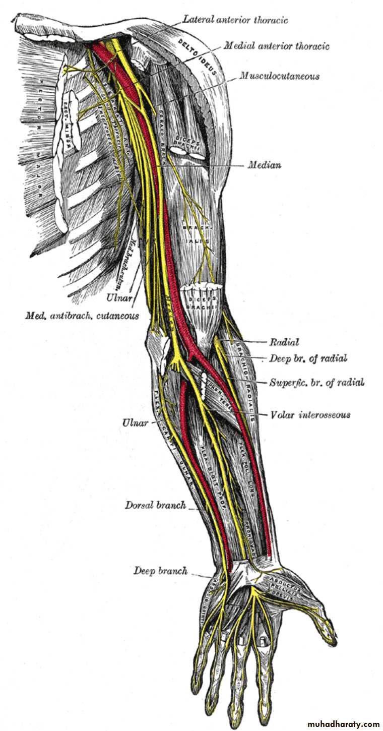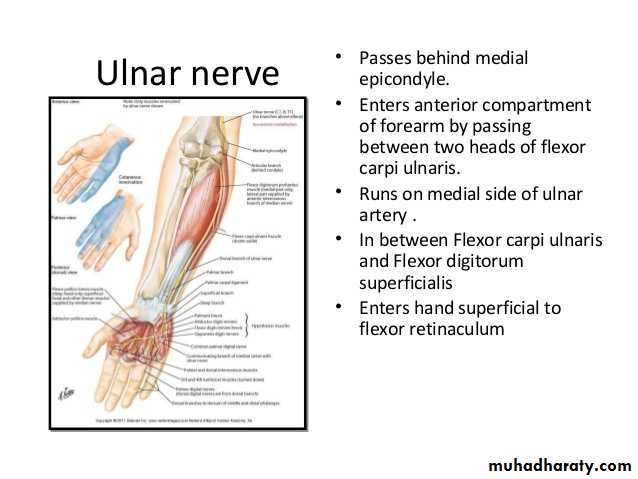 Is one of the branches of the medial cord of the Brachial plexus,it doesn’t supply any structure in the arm,just above the middle part of the Arm it pierces the medial intermuscular septum of the Arm( accompanied by both superior & inferior Ulnar collateral As ).It leaves the Arm by passing behind the medial epicondyle of the humerus to reach the F.A,it passes between the 2 heads of Flexor carpi ulnaris to reach F.A. In the F.A it descends under cover the Flexor carpi ulnaris M accompanied by the Ulnar A .It supplies Flexor carpi ulnaris & medial half of Flexor digitorum profundus M,then at the lower part of the F.A it gives dorsal ulnar cutaneous branch which goes to the back of the hand to supply sensations .Just before it leaves the F.A it gives palmer cutaneous branch which passes superficial to the Flexor retinaculum to reach the Palm of the hand.
