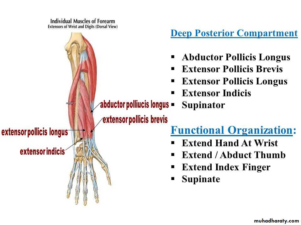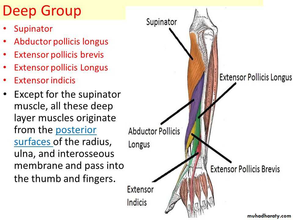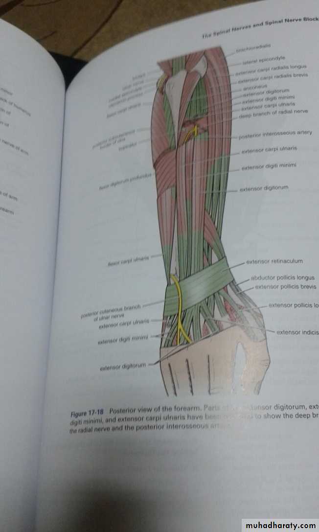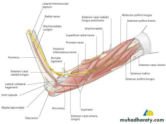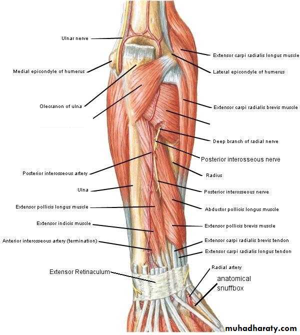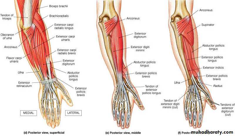 3-Anconeus by the nerve to Anconeus given off by Radial N as it runs in Spiral groove.4-All the rest of the Extensor Ms are supplied by the posterior interosseous N which is the direct continuity of the deep branch of Radial N as it leaves the substance of Supinator M to run on the posterior surface of the interosseous membrane.