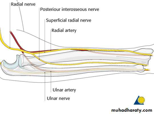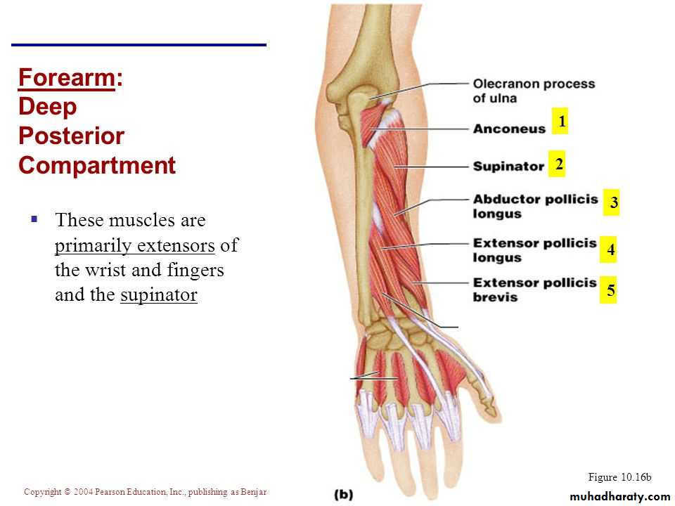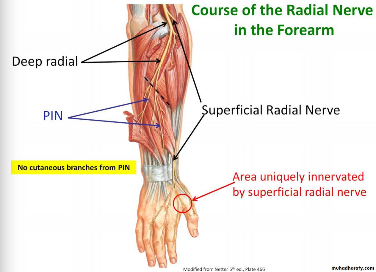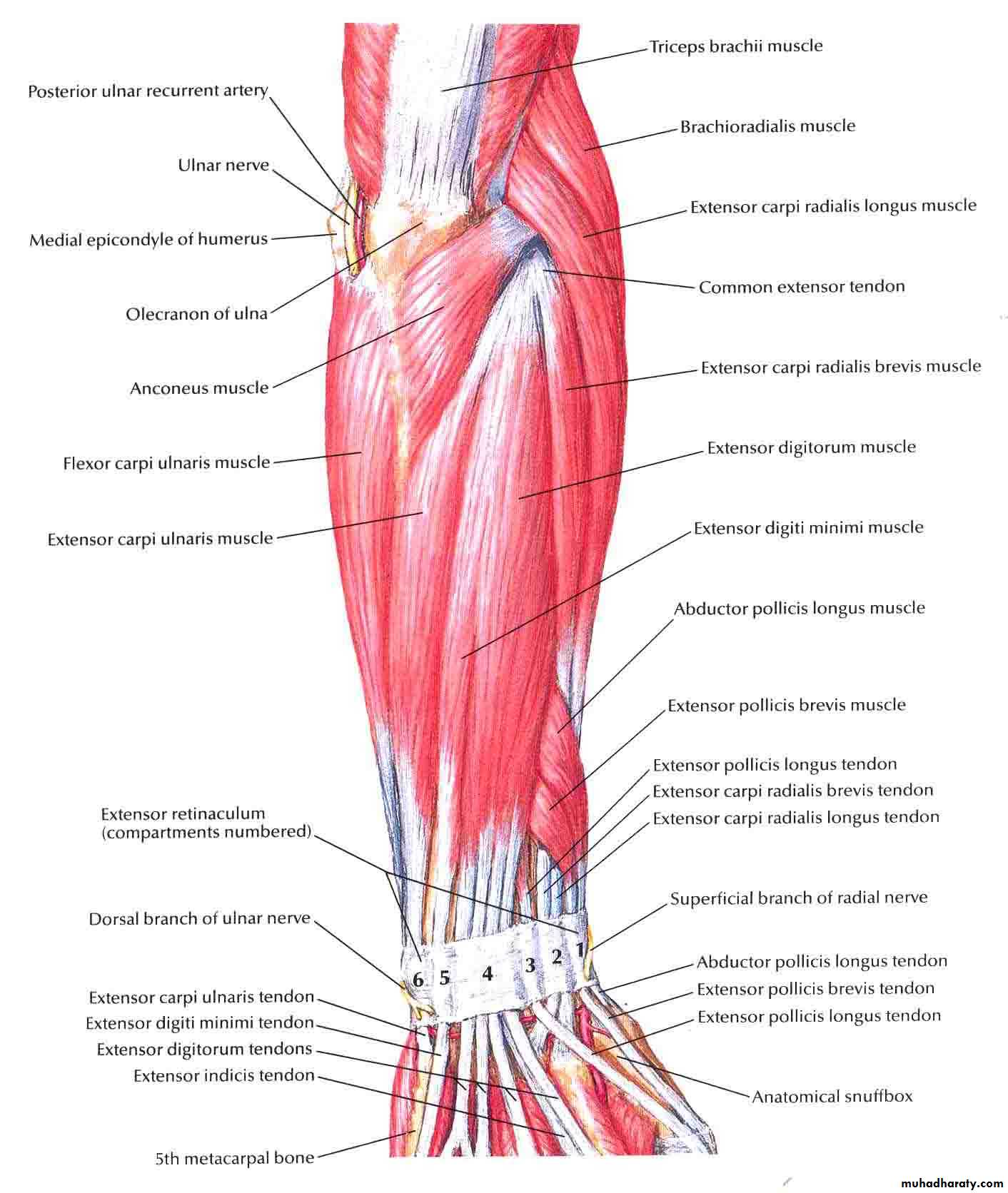 3-Anconeus by the nerve to Anconeus given off by Radial N as it runs in Spiral groove.4-All the rest of the Extensor Ms are supplied by the posterior interosseous N which is the direct continuity of the deep branch of Radial N as it leaves the substance of Supinator M to run on the posterior surface of the interosseous membrane.
