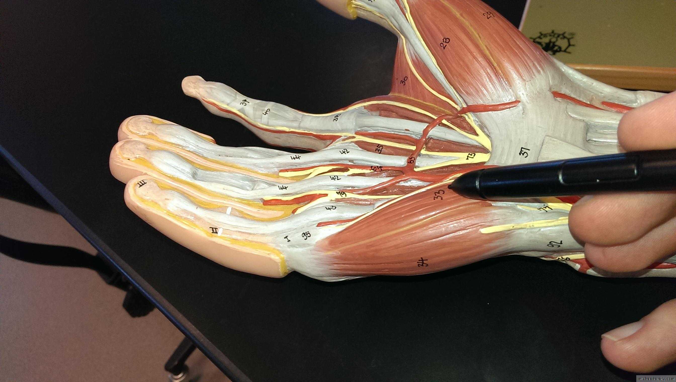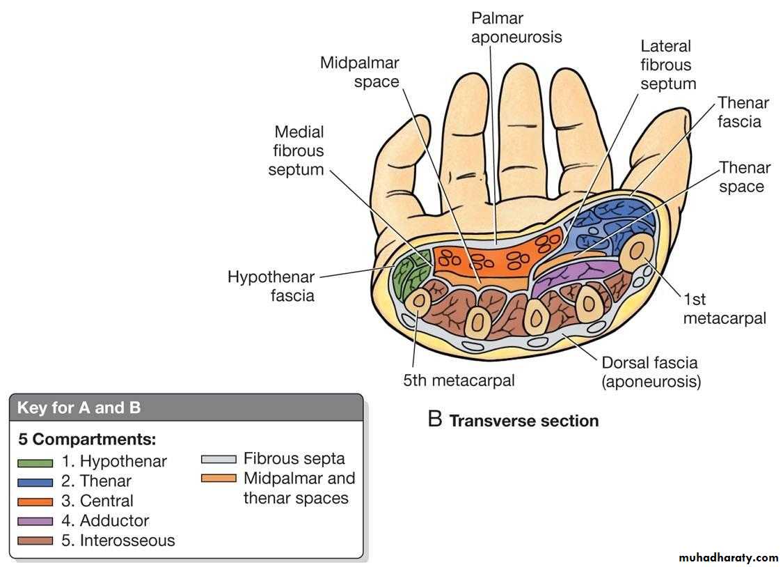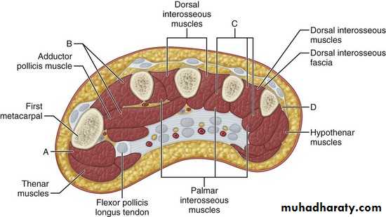 1-The Thennar Space deep to palmar palmar aponeurosis& along the flexor tendons of Index finger & in front of fascia covering Adductor Pollicis M.It is limited by the intermediate & lateral Palmar septae….