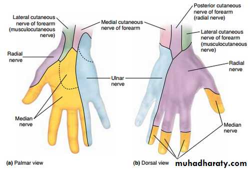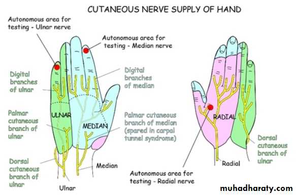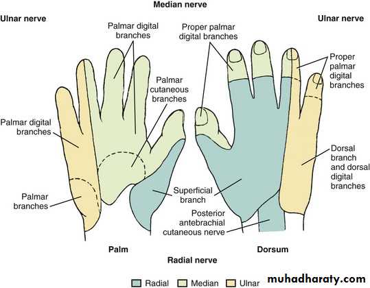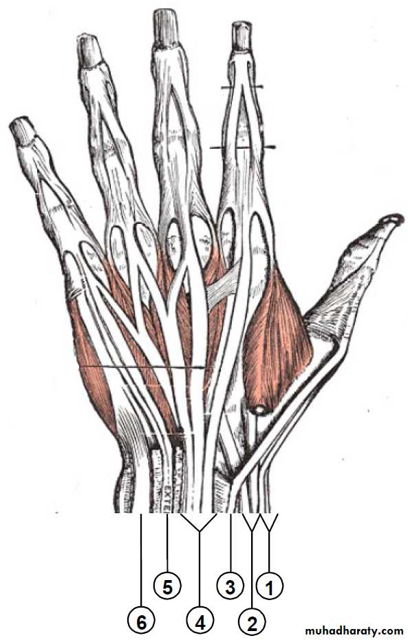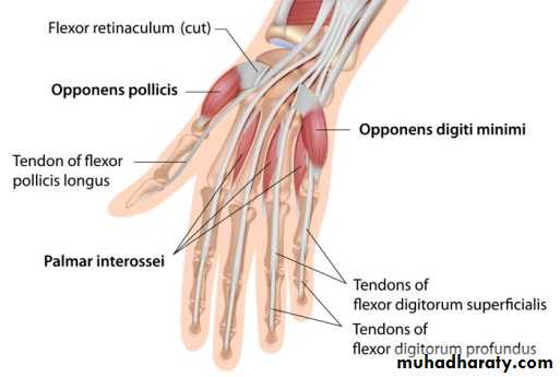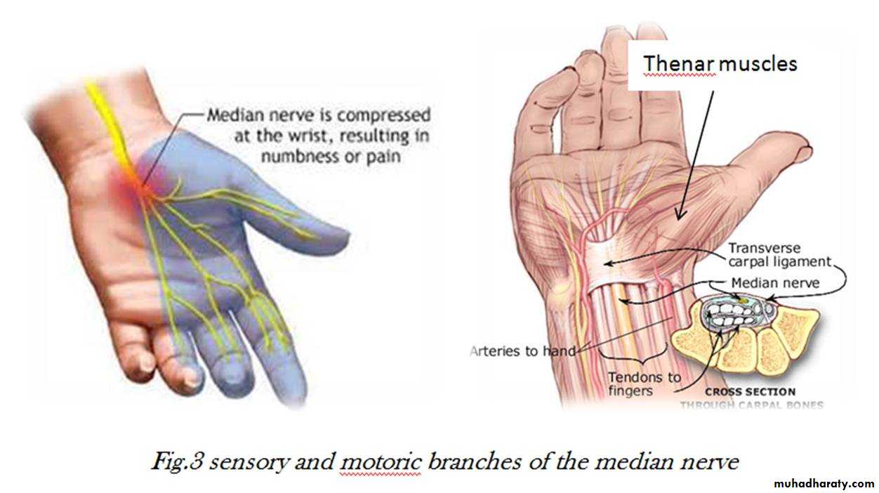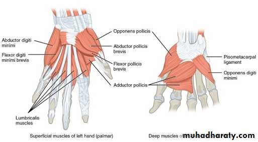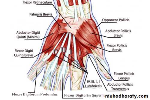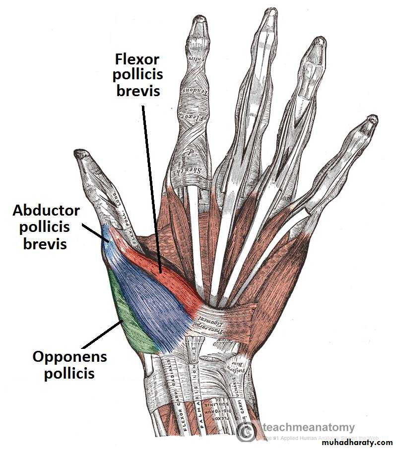 1-The Thenar Compartment ,has 3 muscles, Abductor &Flexor pollicic brevis + OpponencPollocis brevis.They are supplied by recurrent branch of the median nerve.