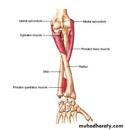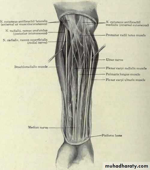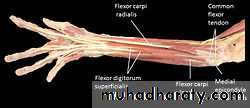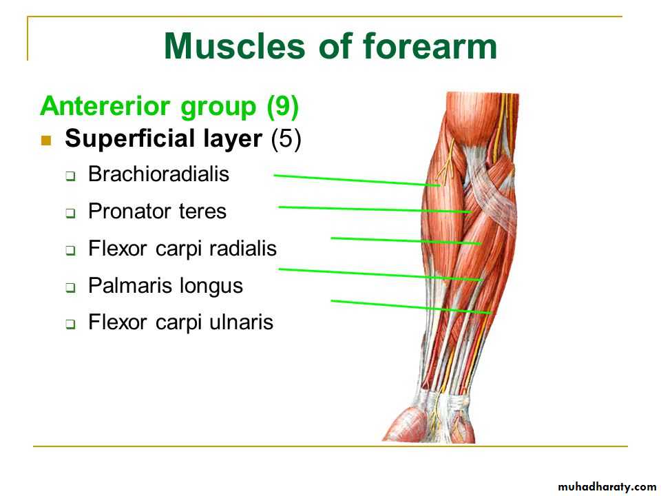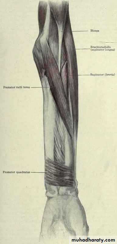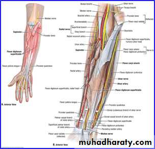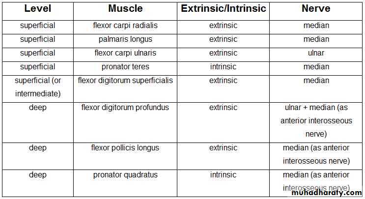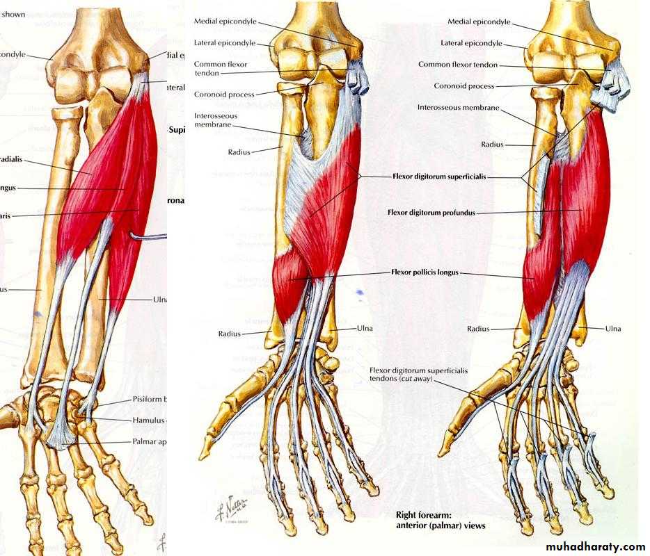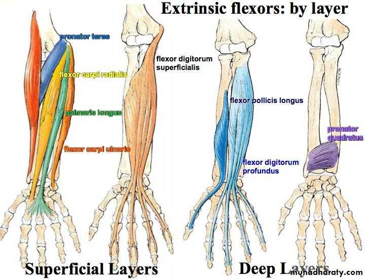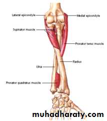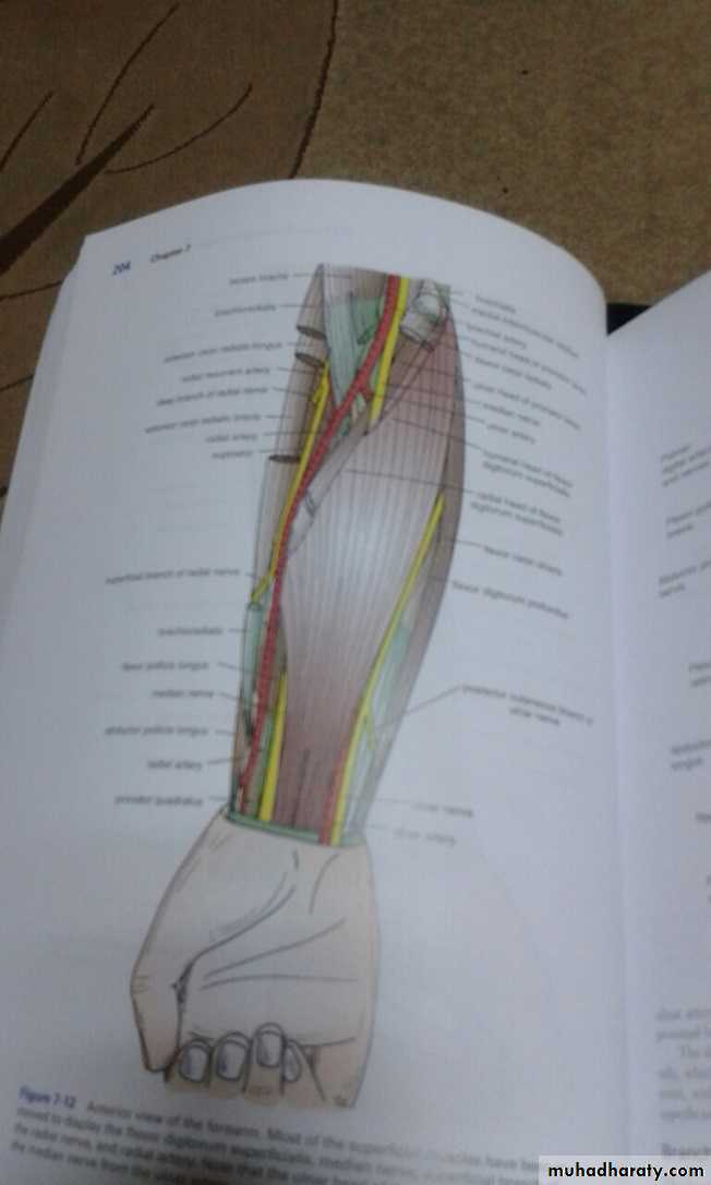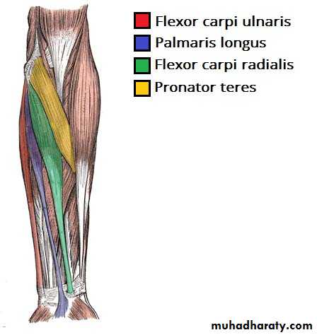 أ.د.عبد الجبار الحبيطيIs the anteromedial compartment of the F.A ,it includes 8 Ms ( 5 of them are superficial & 3 deep).The superficial are Pronater teres,Flexor carpi radialis,Palmaris longus,Flexor digitorum superficialis & Flexor carpi Ulnaris.The other 3 deep Ms are Flexor digitorum profundus, Flexor pollicis longus & Pronater quadratus Ms. Pronater teres takes origin by 2 heads , humeral & ulnar heads,the humeral head arises from medial epicondyle& medial supracondylar line ,while the ulnar head from medial side of Coronoid process of the ulna.The M is inserted into the lateral surface of the middle part of the shaft of the Radius bone.