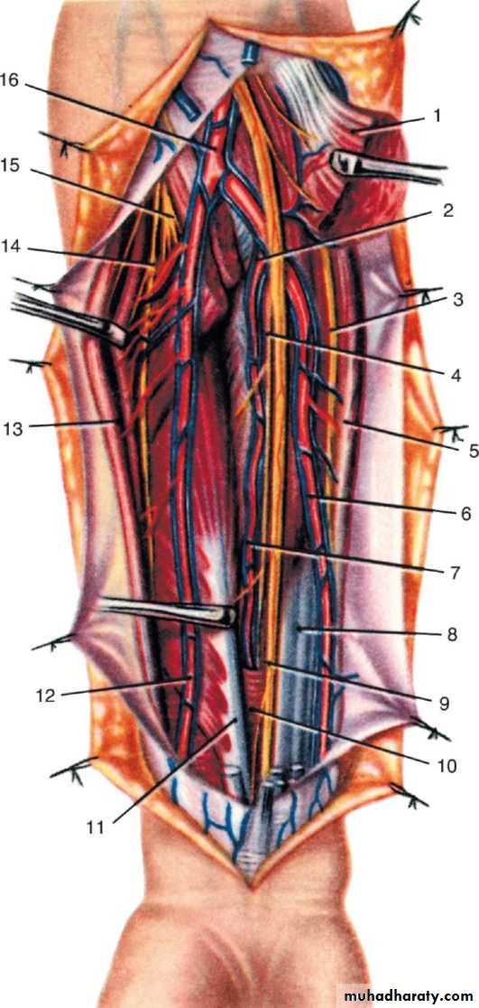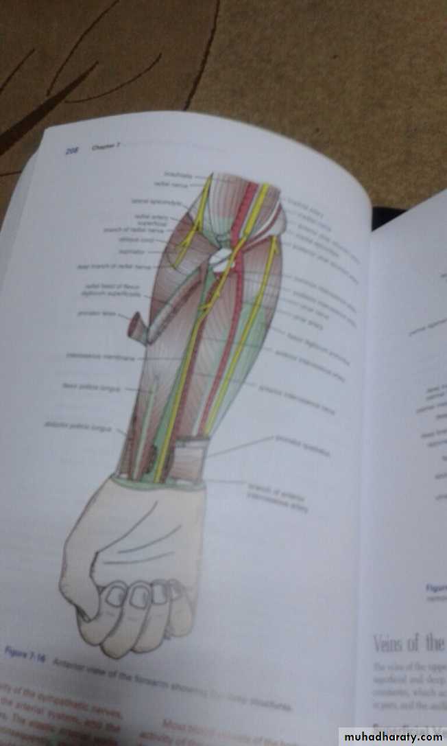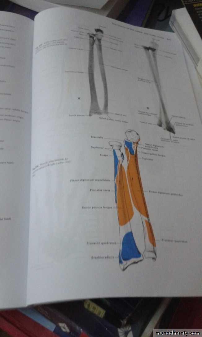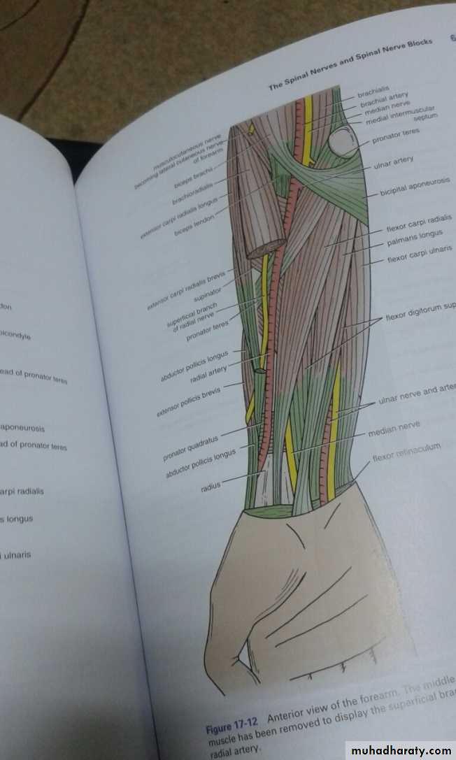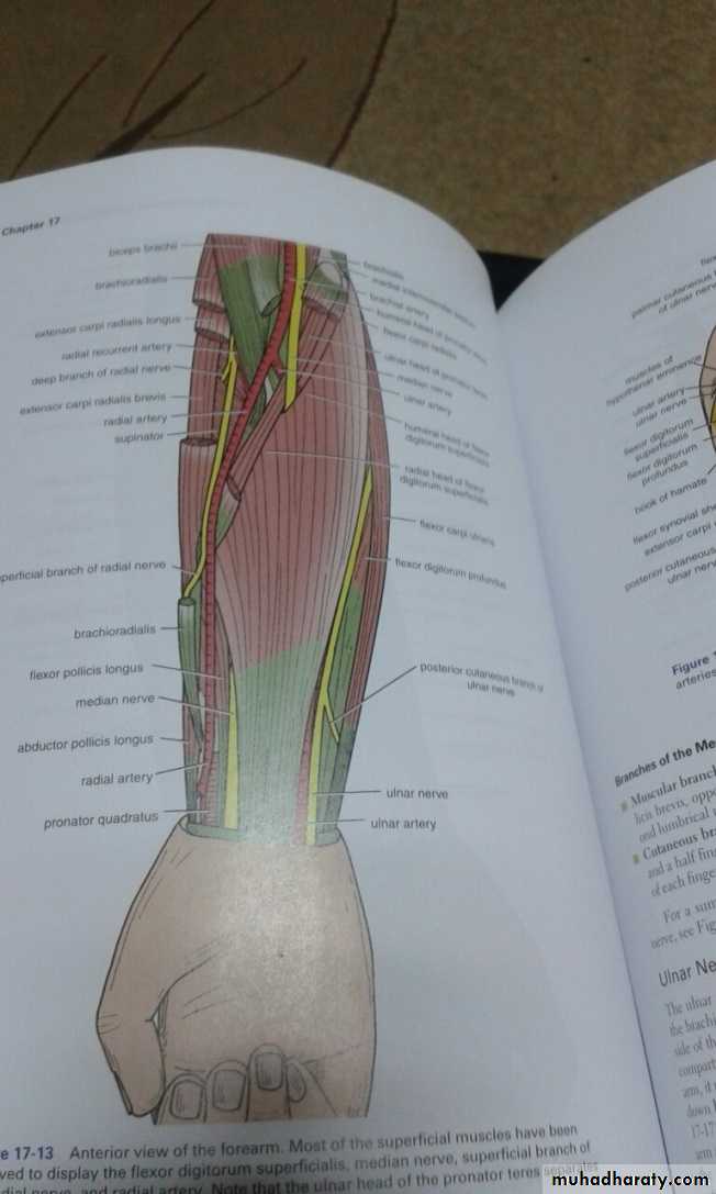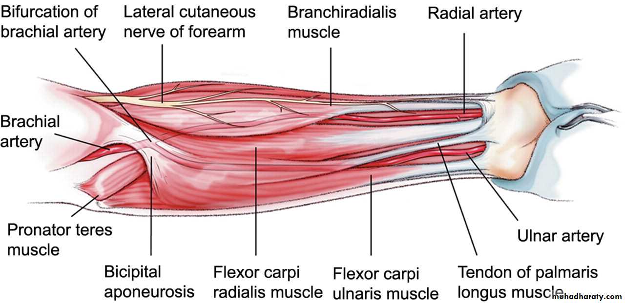 أ.د.عبد الجبار الحبيطيIs the anteromedial compartment of the F.A ,it includes 8 Ms ( 5 of them are superficial & 3 deep).The superficial are Pronater teres,Flexor carpi radialis,Palmaris longus,Flexor digitorum superficialis & Flexor carpi Ulnaris.The other 3 deep Ms are Flexor digitorum profundus, Flexor pollicis longus & Pronater quadratus Ms. Pronater teres takes origin by 2 heads , humeral & ulnar heads,the humeral head arises from medial epicondyle& medial supracondylar line ,while the ulnar head from medial side of Coronoid process of the ulna.The M is inserted into the lateral surface of the middle part of the shaft of the Radius bone.