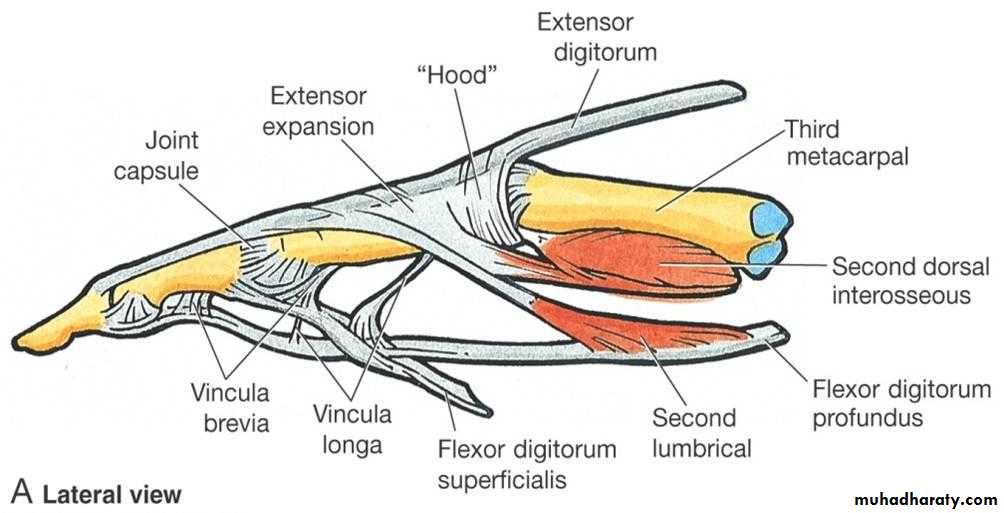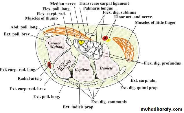 4-The Ulnar Bursa,alarge synovial space enclosing tendon of Flexor digitorum Profundus & Superficialis & extends to proximal third of the metacarpal bone.