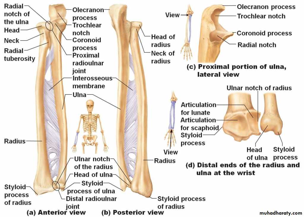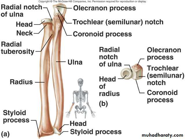 1-Dislocation which is usually a posterior one&is often associated with fracture of the Coronoid process.Here the Anatomical Triangular relation ship between the Olecranon & the 2 Epicondyles is lost.2- Subluxation of the head of Radius(pulled elbow) occurs in children when the F.A is suddenly pulled in Pronation movement.The head of the Radius slips away from the Annular ligament.The Elbow is kept fixed in slight Flexion & Pronation,while Supination is limited and is painfull.