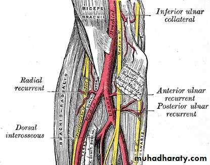 The joint are supplied by articular (sensory) branches from Radial & Musculocutaneous nerves.The blood supply by branches from the anastomosis around the Elbow joint.The main movements at the joint are the followings: