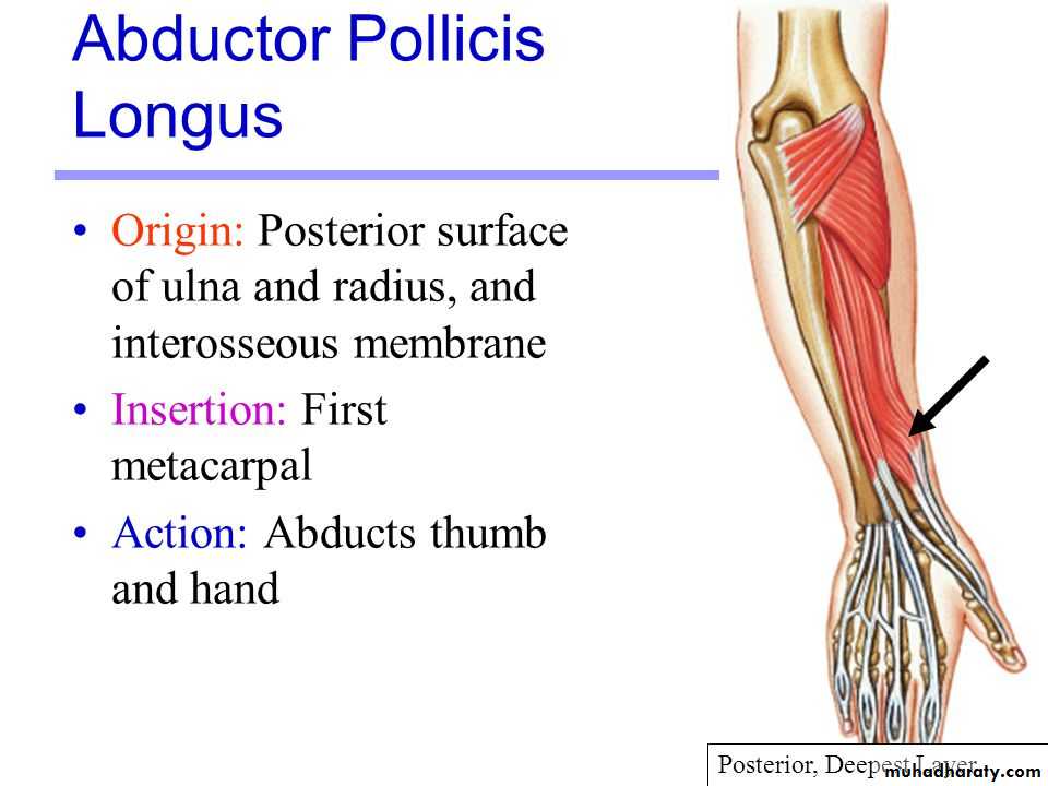 Abductor pollicis longus takes origin from posterior surface of Ulna & Radius below the Anconeus.It is inserted into the base of 1st metacarpal bone.