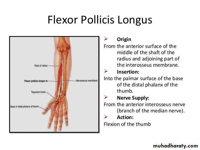 Flexor pollicis longus takes origin from middle 2/4 of anterior surface of Radius bone &interosseous membrane.The M inserts into the base of distal phalanx of the thumb.