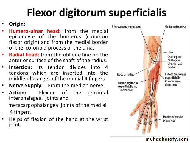 Flexor digitorum superficialis has 2 heads of origin too humeral & radial heads ,humeral from medial epicondyle,ulnar collateral ligament & medial margin of coronoid process of ulna bone.while the radial head arises from oblique line on the anterior surface of the radius bone.The M gives 4 tendons to the medial 4 fingers( each tendon inserts into the sides of the middle phalange of the corresponding finger).
