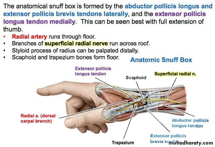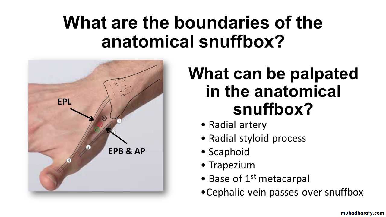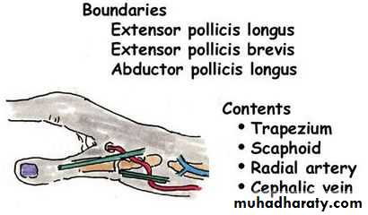 Is seen at the base of the Thumbposteriorly,it is bounded laterally ( or anteriorly )by the tendons of Abductor pollicis longus & that of Extensor pollicis brevis,while medially ( or posteriorly) by the tendon of Extensor pollicis longus.Its roof is formed by the skin & fascia being crossed superficially by the terminal branches of superficial branch of Radial N & the beginning of Cephalic vein,where as its floor is formed by Scaphoid bone + Styloid process of the Radius bonelying on them the Radial artery ( feel pulsation here).