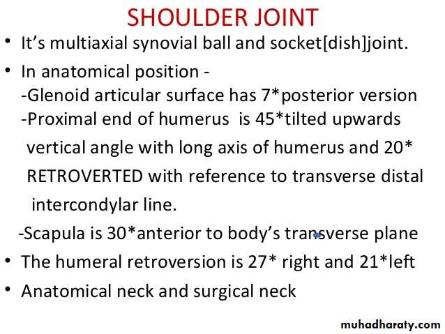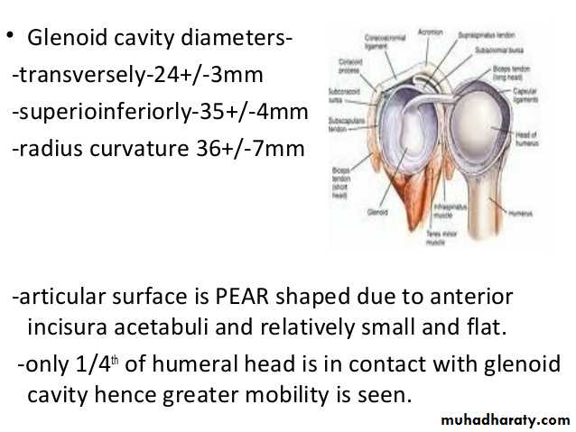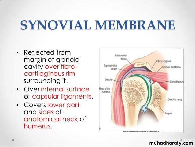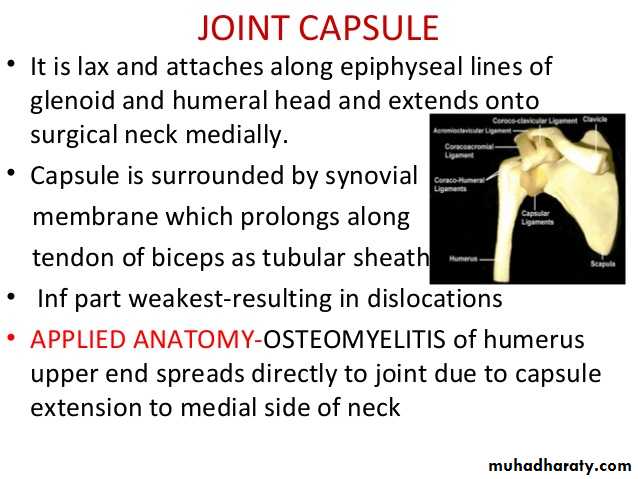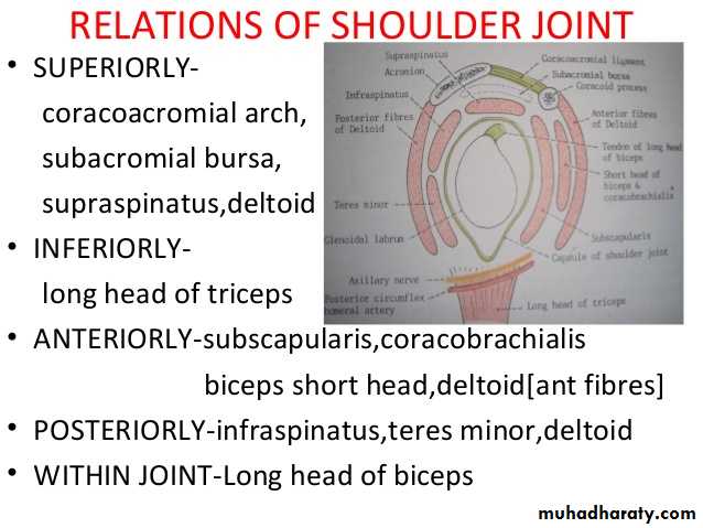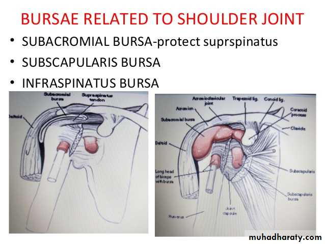 • 5-There are 4 bursae related to the joint ,these are the subscapular,infraspinatous, Subacromial & subcoracoid bursae.