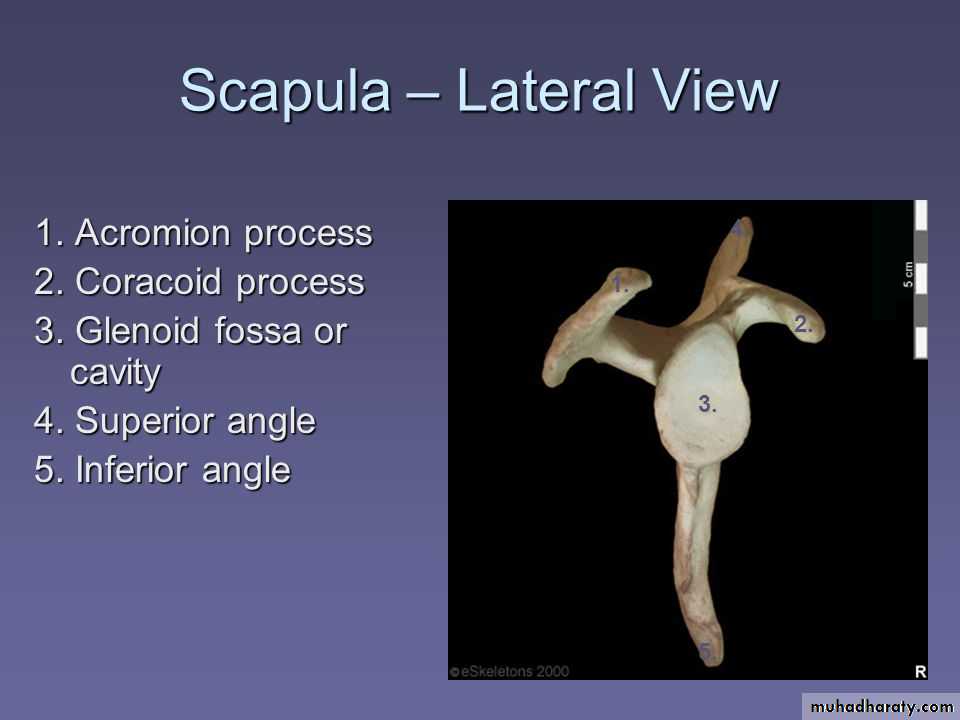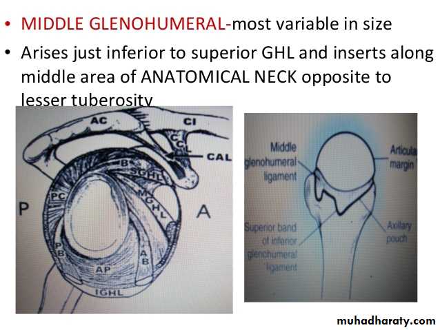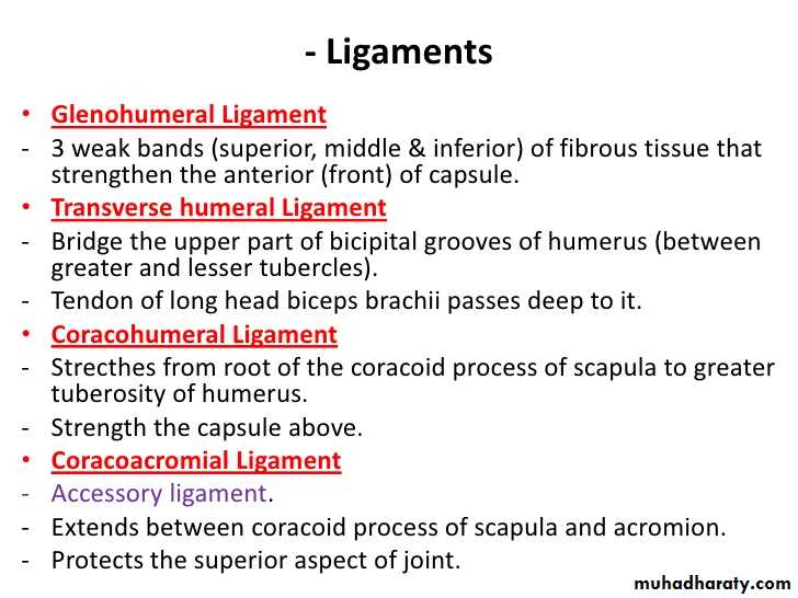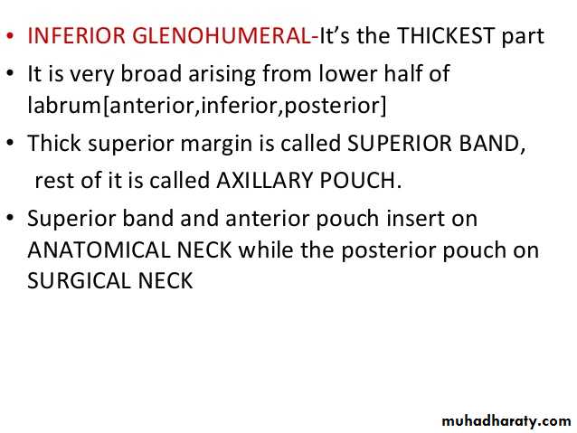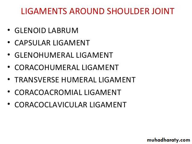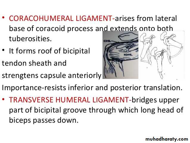 • 4-Coraco-acromial ligament( accessory),its apex attached to the a cromion & its base attaches to the lateral border of the Coracoid process.