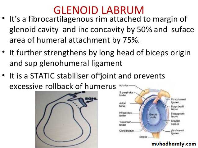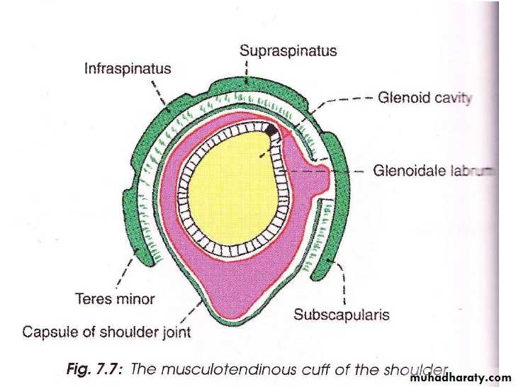 It is a synovial joint of ball & socket variety between the shallow glenoid cavity of Scapula & hemispheroidal head of Humerus ( both articular surfaces are covered by hyaline cartilage.The concavity of Glenoid fossa is deepened by a fibro-cartilagenous rim known as Glenoid labrum.The thin & lax capsule allows freedom of movements at the joint ,it is re-inforced by the tendons of the Rotator cuff Ms.The capsule is lined by from inside by synovial membrane which forms a cavity ( synovial cavity).The ligaments of the joint are:THE SHOULDER JOINT