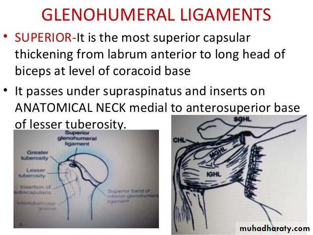 • 1- Glenohumeral ligaments which are 3 in number, superior ,middle & inferior (known as intrinsic ligaments).