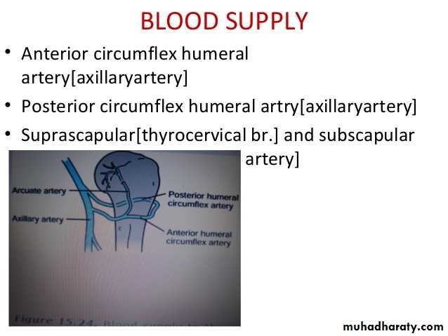 The joint receives articular ( sensory ) nerve supply from the Axillary & suprascapular nerves.It receives blood supply from anterior & posterior circumflex humeral ,and also from circumflex scaular & suprascapular arteries.The movements are as follows: