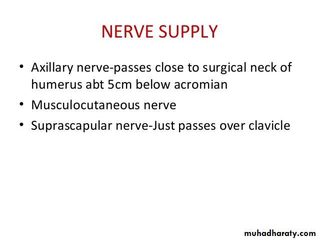 • 1-Due to instability of the joint & laxity of the capsule,it is frequently lible to inferior dislocation( the capsule here is least protected by muscles.This dislocation may cause injury or pressure on the Axillary nerve.