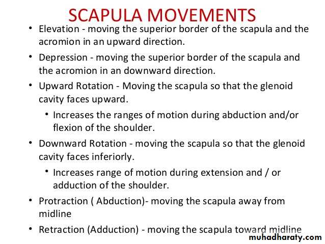 • 3-Abduction by supraspinatous up to 18 degree,then by the lateral fibers of Deltoid from 18—90 degree.Beyond 80 degree occurs at the shoulder girdle due to rotation of scapula by Trapezius & Serratus anterior muscles.