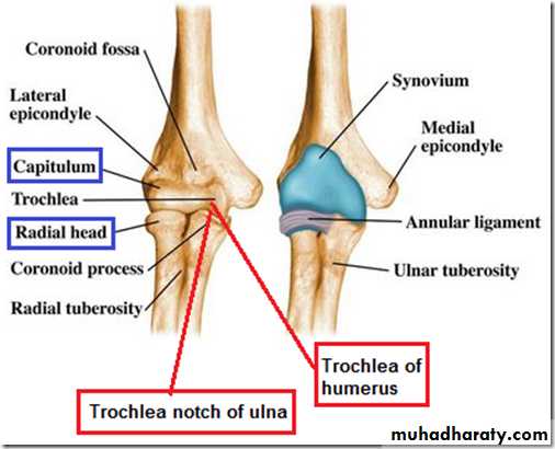 Is a compound synovial joint of hing variety,includes 2 articulations a Humeroulnar & Humeroradial.The Trochlea of the humerus articulates with the Trochlear notch of Ulna.The Capitulum of Humerus articulates with head of Radius,they are covered by hyaline cartilage.The capsule is attached (above ) in front to the medial epicondyle&upper margins of Coronoid & Radial fossa,but from behind along the trochlear margin,margin of Olecranon fossa & over the Capitulum.Below along the margins of the Coronoid & Olecranon processes and to the Annular ligament around the head of the Radius.The inner surface of the Capsule & the 3 fossae are lined by synovial membrane.