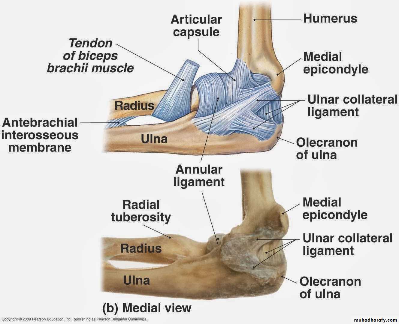 1-Ulnar collateral(Medial) ligament.It is triangular band with anterior,posterior & inferior thick bands and middle thin part.2-Radial collateral (lateral) ligament .It extends from lateral epicondyle of the Humerus to the Annular collateral ligament.