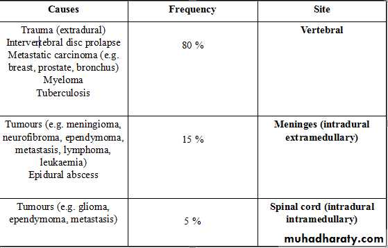 Acute spinal cord compression is one of the most common neurological emergencies encountered in clinical practice. A space-occupying lesion within the spinal canal may damage nerve tissue either directly by pressure or indirectly by interfering with blood supply. Oedema from venous obstruction impairs neuronal function, and ischaemia from arterial obstruction may lead to necrosis of the spinal cord. The early stages of damage are reversible but severely damaged neurons do not recover; hence the importance of early diagnosis and treatment.