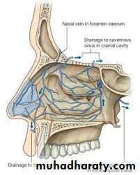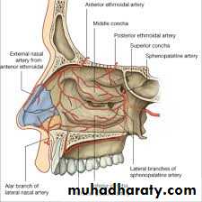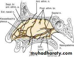 The olfactory nerves from the olfactory mucous membrane ascend the cribriform plate of the ethmoid bone to the olfactory bulbs. The nerves of ordinary sensation are branches of the ophthalmic division ( VI) and the maxillary division (V2) of the trigeminal nerve .Blood supply to the medial and lateral wall of nasal cavity is from five sources: