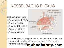 The first three artery divide into lateral and medial ( septal) branches. The anterior part of the nasal septum is the site( kiesselbach area ) of an anastomotic arterial plexus involving all five arteries supplying the septum. The external nose also receives blood from first and fifth arteries listed plus nasal branches of the infraorbital artery and the lateral nasal branches of the facial artery.
