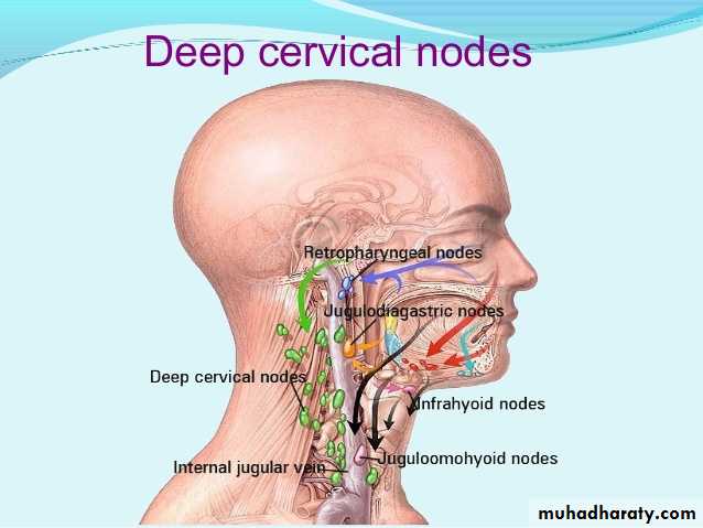 The lymph vessels draining the vestibule in to the submandibular nodes . the remainder of the nasal cavity is drained by that pass to the upper deep cervical nodes.