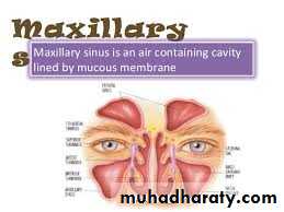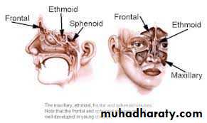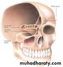 The paranasal sinuses are cavities found in the interior of maxilla , frontal, sphenoid, and ethmoid bones.They are lined with mucoperiosteum and filled with air; they communicate with the nasal cavity through relatively small apertures. The maxillary and sphenoidal sinuses are Present in a rudimentary form at birth; they enlarge appreciably after the eight year and become fully formed in adolescence.