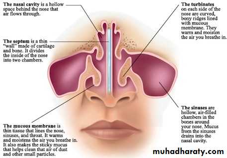 The vestibule is lined with modified skin and has coarse hairs . the area above the superior concha is lined with olfactory mucous membrane and contains nerve endings sensitive to the reception of smell. The lower part of the nasal cavity lined with respiratory mucous membrane. A large plexus of veins in the submucous connective tissue is present in the respiratory region.Function of warm blood in the venous plexuses serves to heat up inspired air as it enters the respiratory system . the presence of mucus on the surfaces of the conchae traps foreign particles and organisms in the inspired air, which are then swallowed and destroy by gastric acid.