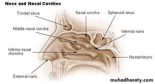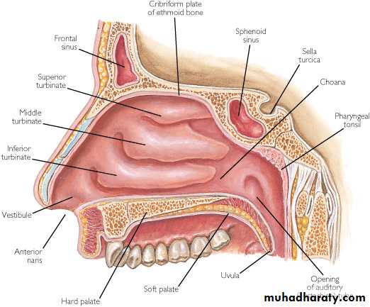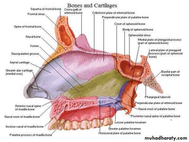 Each half of the nasal cavity has a floor, a roof , a lateral wall, and a medial or septal wall .Floor