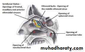 Middle meatus: the middle meatus lies below the middle concha. It has a rounded swelling called the bulla ethmoidalis that is formed by the middle ethmoidal air sinuses, which open on its upper border. A curved opening , the hiatus semilunaris, lies just below the bulla. The anterior end of the hiatus leads into a funnel-shaped channel called the infundibulum, which is continuous with the frontal sinus. The maxillary sinus opens into the middle meatus through the hiatus semilunaris.